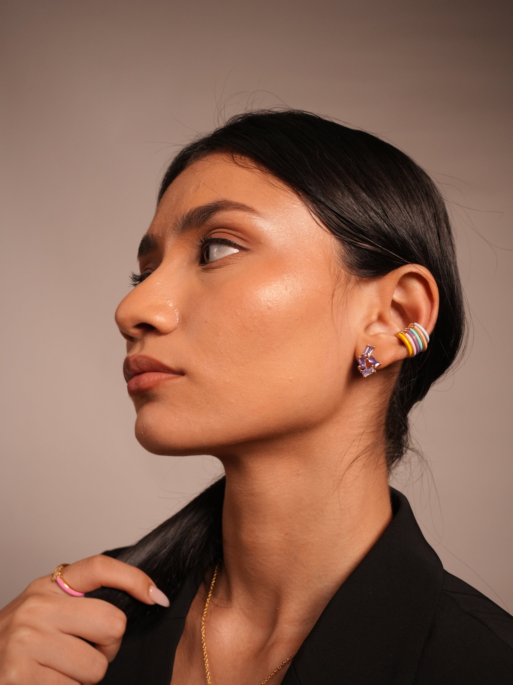 Add a vibrant splash of color to your look with this playful set of hoop earrings. Expertly crafted from high-quality brass and coated in luxurious 22kt gold plating, these hoops feature a striking array of pastel enamel shades, making them perfect for mixing and matching or wearing as a coordinated set. The earrings are protected with a durable E-coating, ensuring long-lasting shine and resistance to tarnish. Their lightweight, comfortable design makes them ideal for daily wear, while the bold colors and modern style bring a fun, youthful energy to any outfit. Perfect for those who love a pop of color in their accessories!