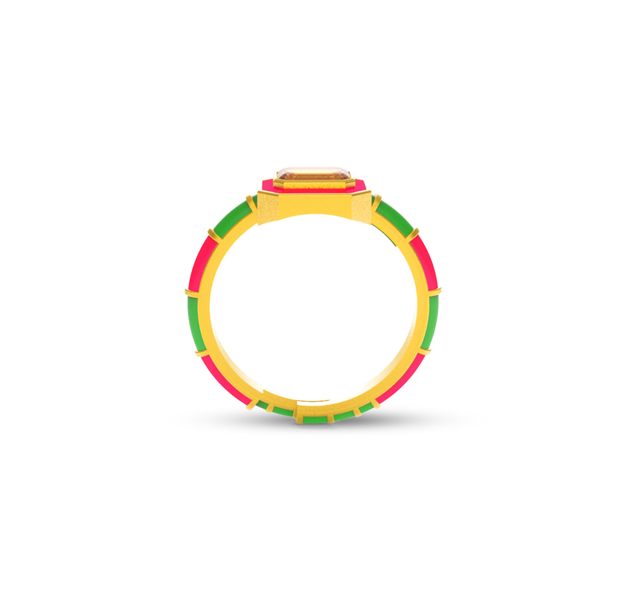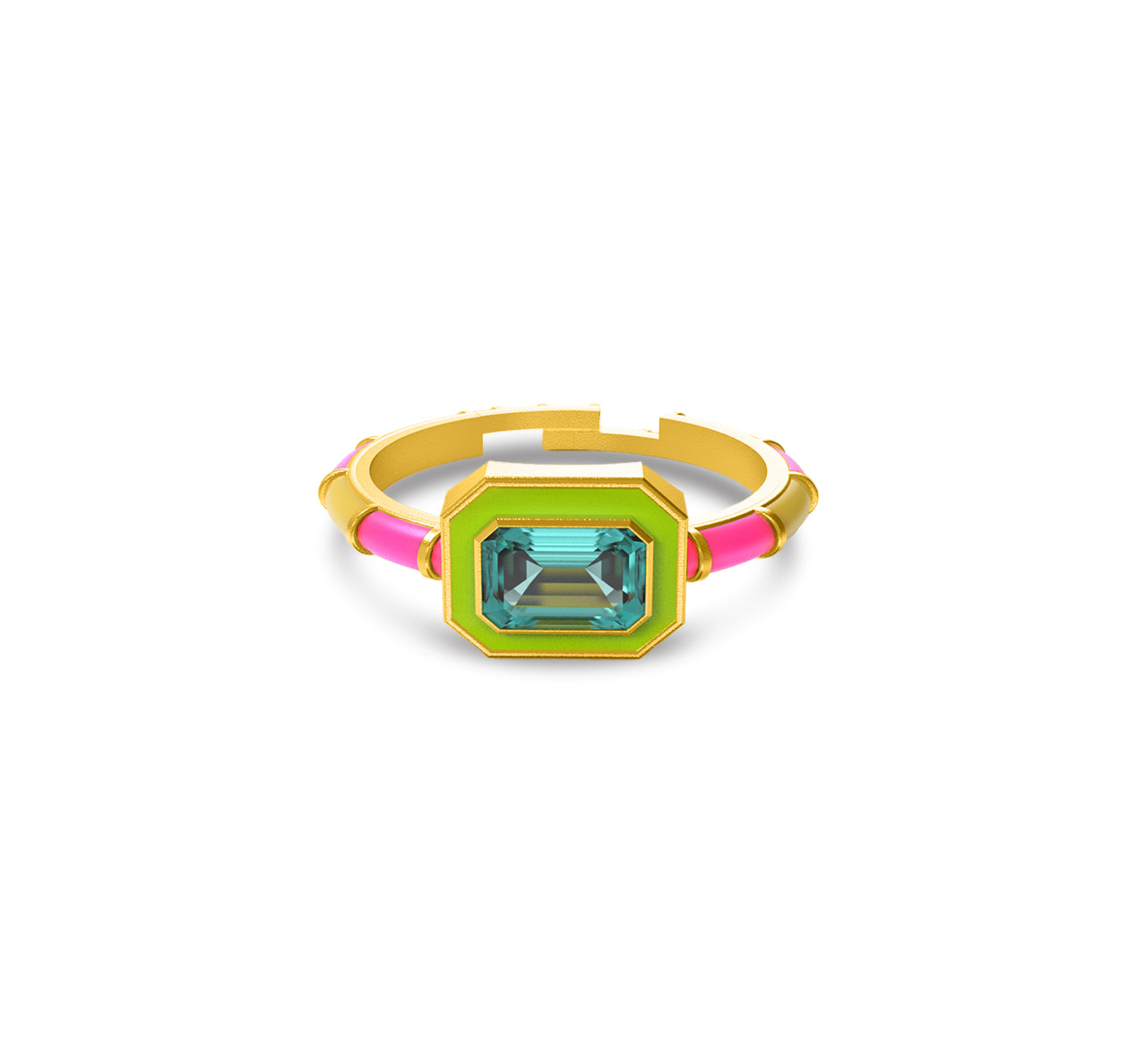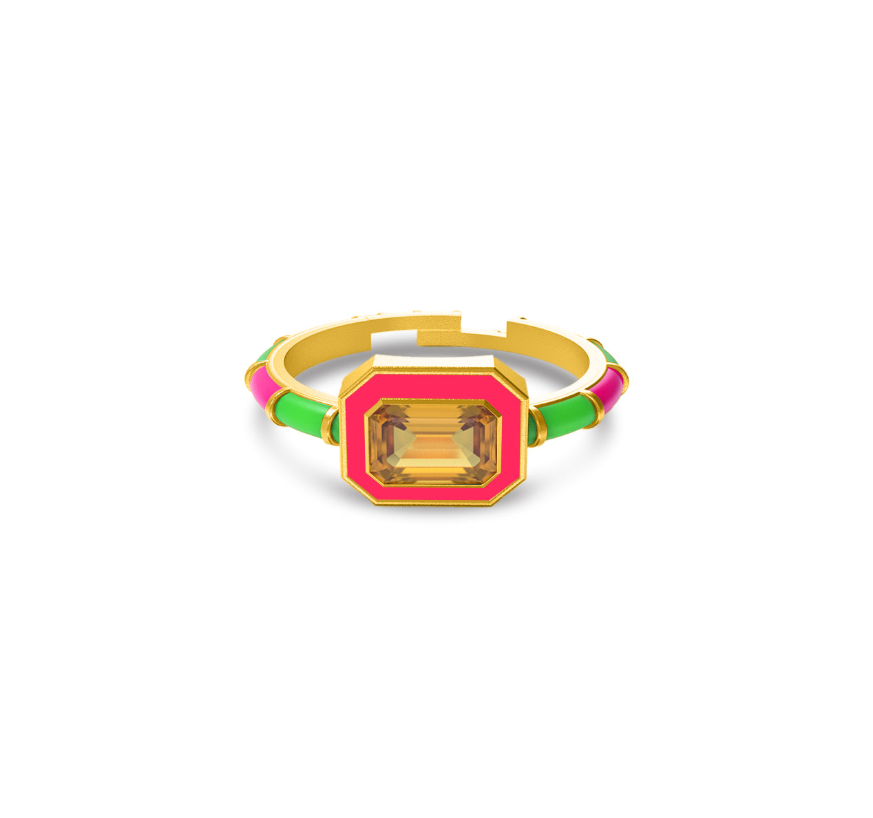 Bold, vibrant, and utterly unique, these rings are a perfect statement piece for any fashion-forward individual. Crafted from premium brass and finished with a 22kt gold plating, they exude a luxurious shine. The rings feature striking rectangular gemstones, framed by colorful enamel bands that contrast beautifully with the gold accents. Each piece is coated with a protective E-coating, ensuring lasting durability and brilliance. Perfect for stacking or wearing alone, these rings are a playful yet sophisticated addition to any jewelry collection, adding a pop of color and sparkle to any outfit. Ideal for those who love to express their individuality with their accessories.