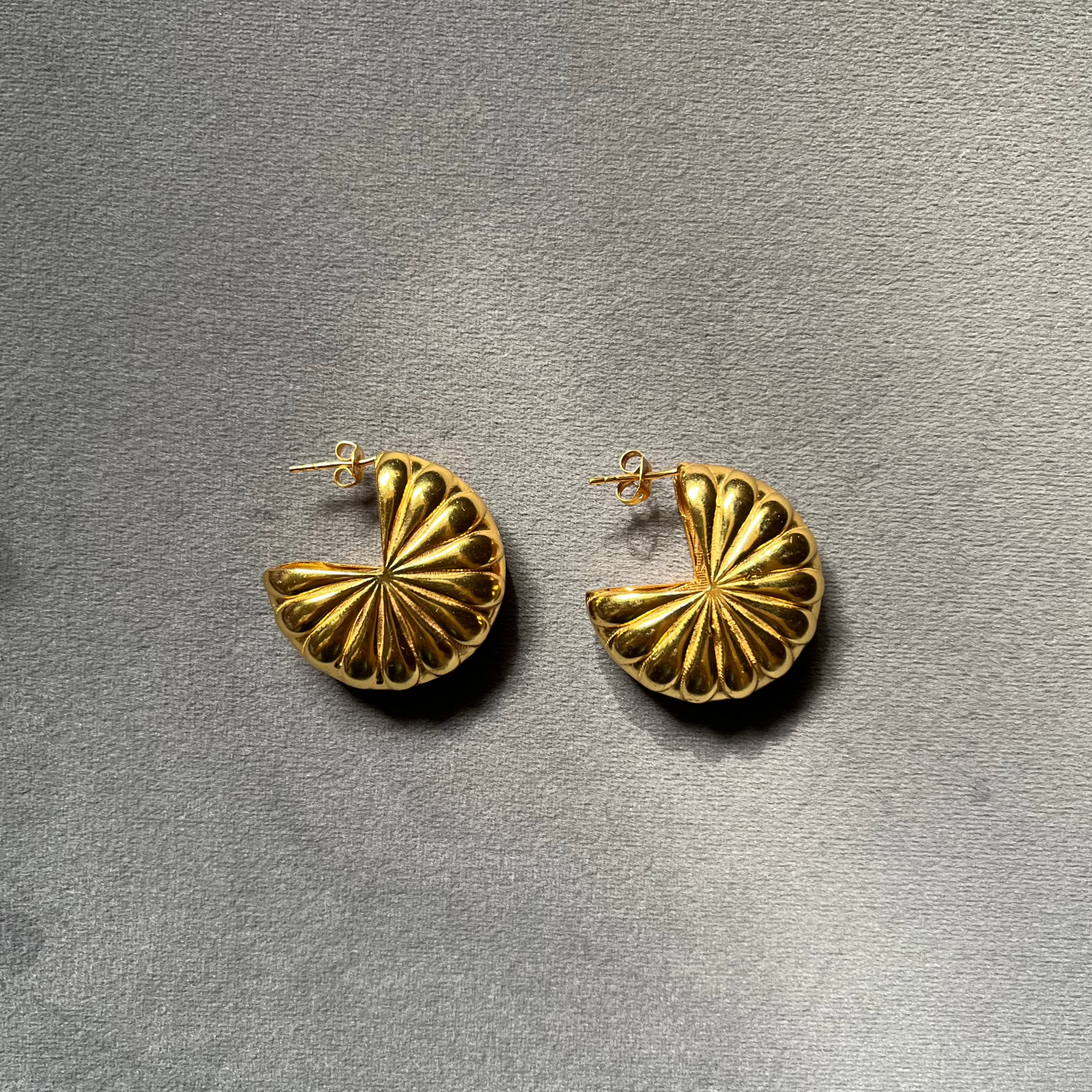 These striking, shell-inspired earrings are designed to make a bold statement. Crafted from premium brass with a luxurious 22kt gold plating, their radiant design captures the essence of classic elegance with a modern twist. The intricate ridged detailing mimics the natural beauty of seashells, adding texture and dimension to these standout pieces. Finished with a protective E-coating, they ensure long-lasting durability and a high-gloss finish. Lightweight and versatile, these earrings are perfect for adding a touch of glamour to both casual and formal looks, offering a timeless accessory that exudes both sophistication and style.