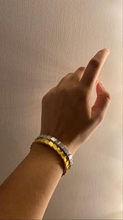 These sleek and modern bracelets are crafted from premium brass and plated with 22kt gold and silver, offering a stunning two-tone finish that elevates any look. The bold geometric design of the interlocking links creates a contemporary yet timeless aesthetic. Each piece is protected with an E-coating to ensure long-lasting durability and resistance to tarnishing. Perfect for stacking or wearing alone, these versatile bracelets add a touch of sophistication and shine, making them the ideal accessory for both casual and formal outfits.