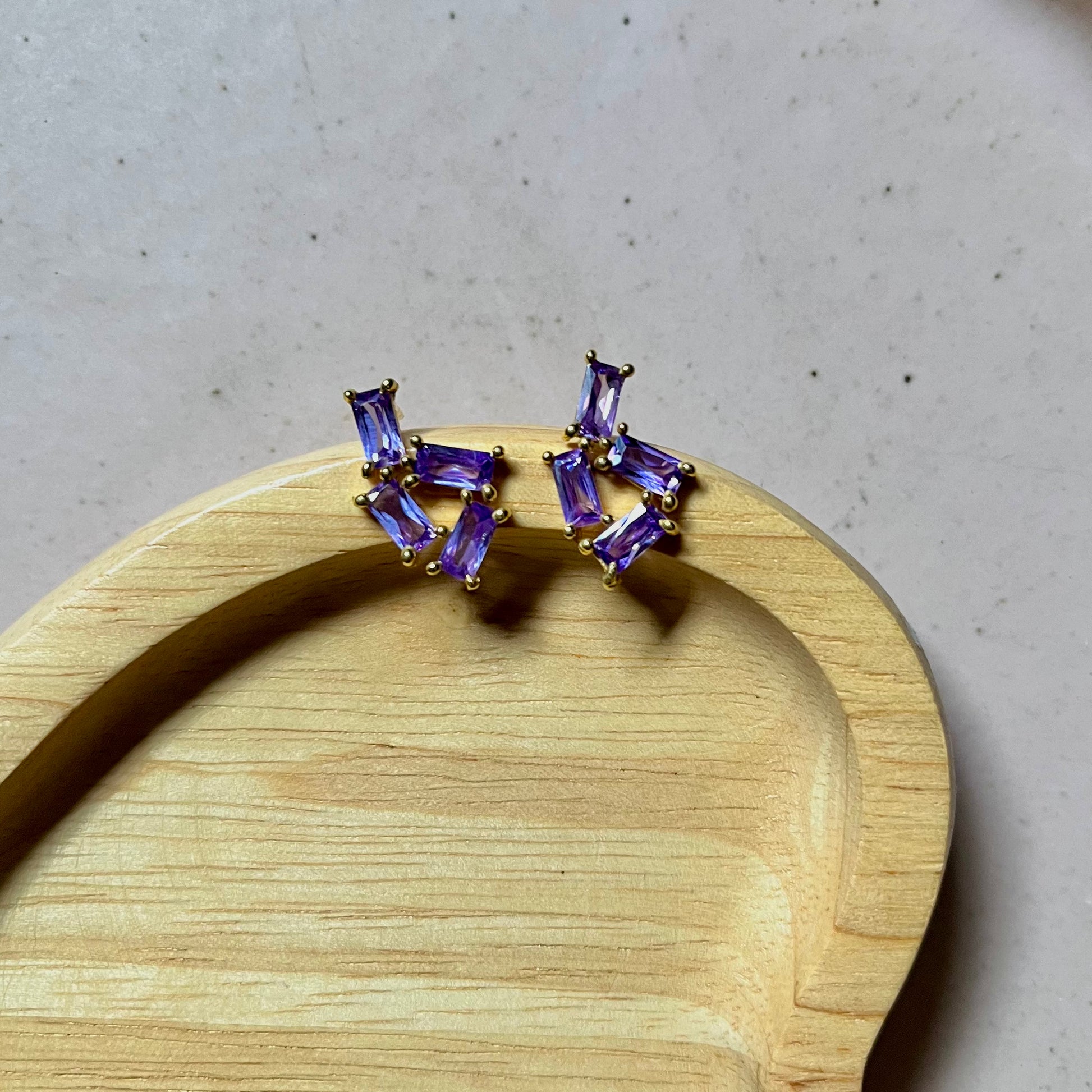 These exquisite earrings are a perfect blend of elegance and modernity, crafted from high-quality brass with a luxurious 22kt gold plating. Featuring a stunning arrangement of baguette-cut lavender gemstones, these earrings create a captivating geometric design that adds a touch of sophistication to any outfit. The vibrant gemstones are beautifully complemented by the warm gold setting, while the durable E-coating ensures lasting shine and protection from tarnishing. Lightweight and versatile, these earrings are ideal for both casual and formal occasions, adding a pop of color and refined sparkle to your jewelry collection.