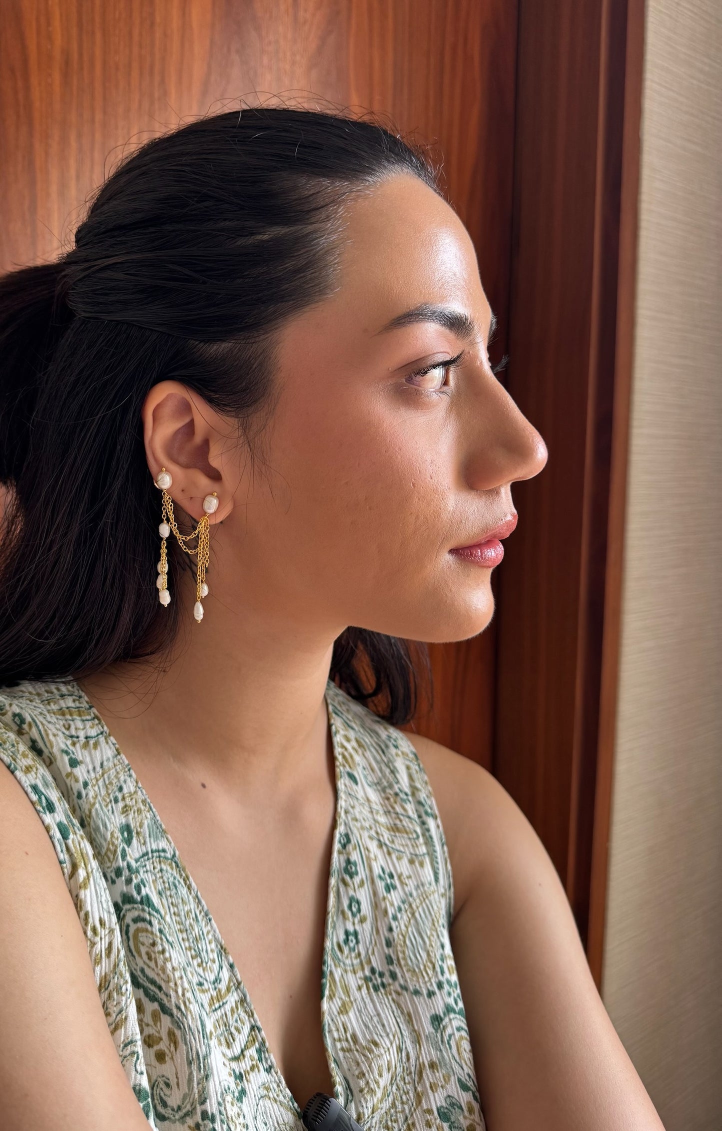 Crafted exclusively for double piercings, the Chainfall Earrings create a cascading silhouette that flows effortlessly along the ear. With two pearl-studded studs linked by fine gold-toned chains, the design is refined, structured, and undeniably striking.