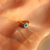 Beautifully handcrafted chain ring with a mother of pearl evil eye. Making it a classy must-have piece in your jewellery collection.