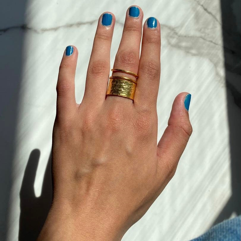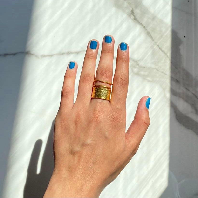 Introducing the MYRHAbyrhea Hammered Block Ring - a piece of jewellery that exudes boldness and minimalism in equal measure. Crafted with care by our skilled artisans, this ring is made of high-quality brass and electroplated with 18kt gold, ensuring a long-lasting and durable finish.