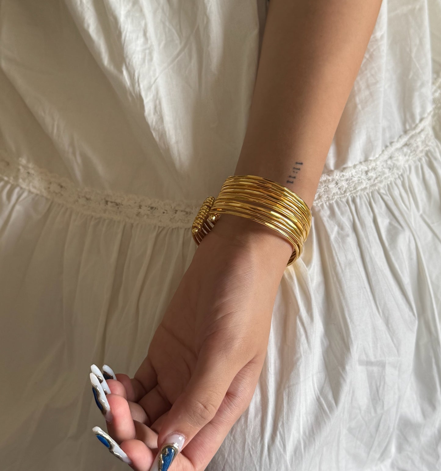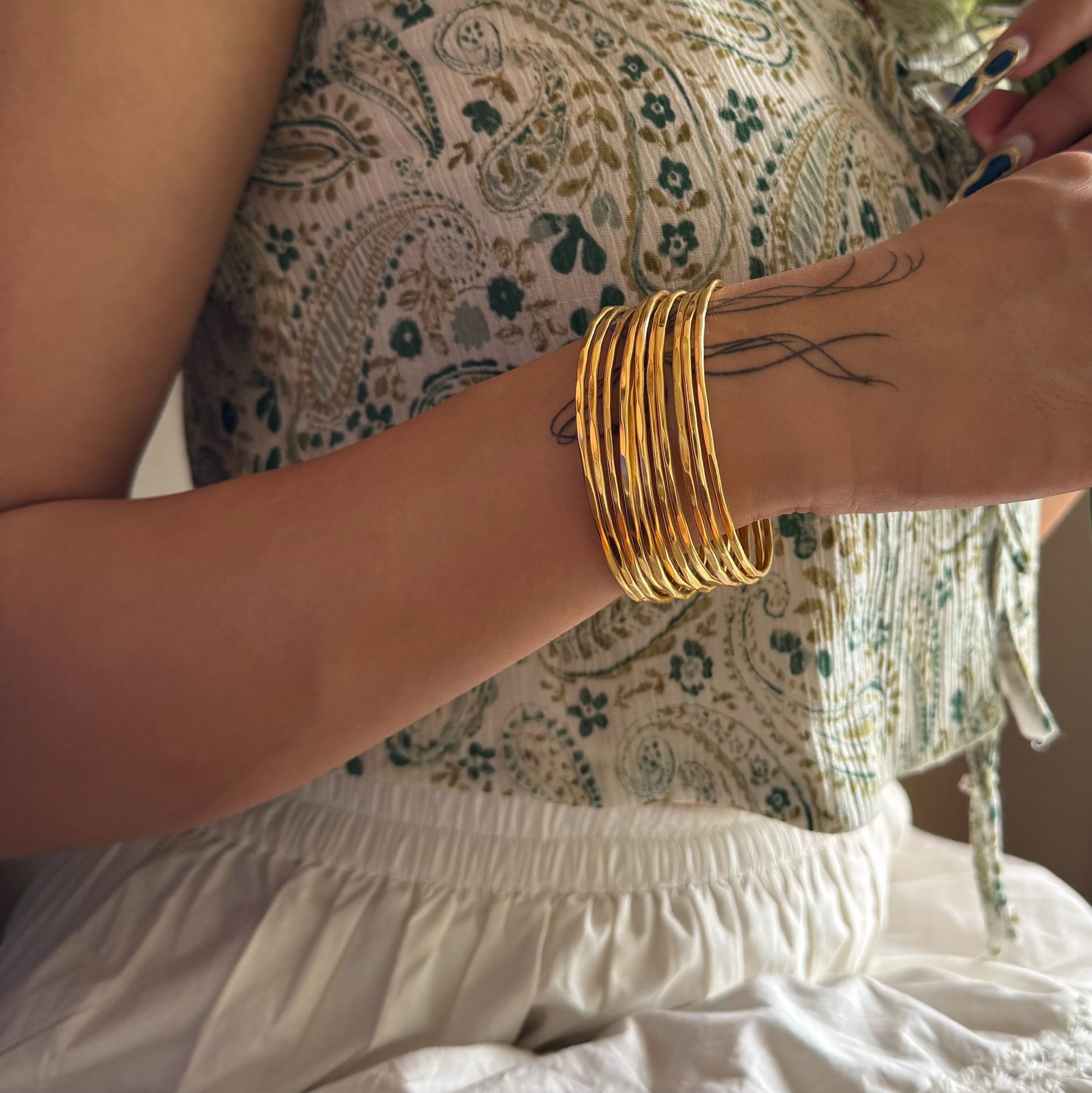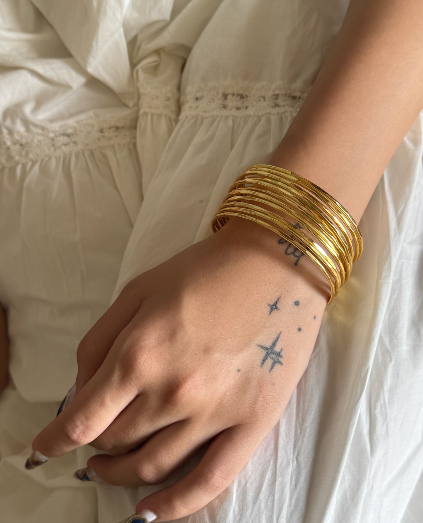 A timeless classic with a contemporary edge, the Lustre Bangles are a set of high-shine, gold-toned bangles that catch the light with every movement. Designed to be worn stacked or styled solo, they bring fluidity, boldness, and everyday elegance to your wrist.