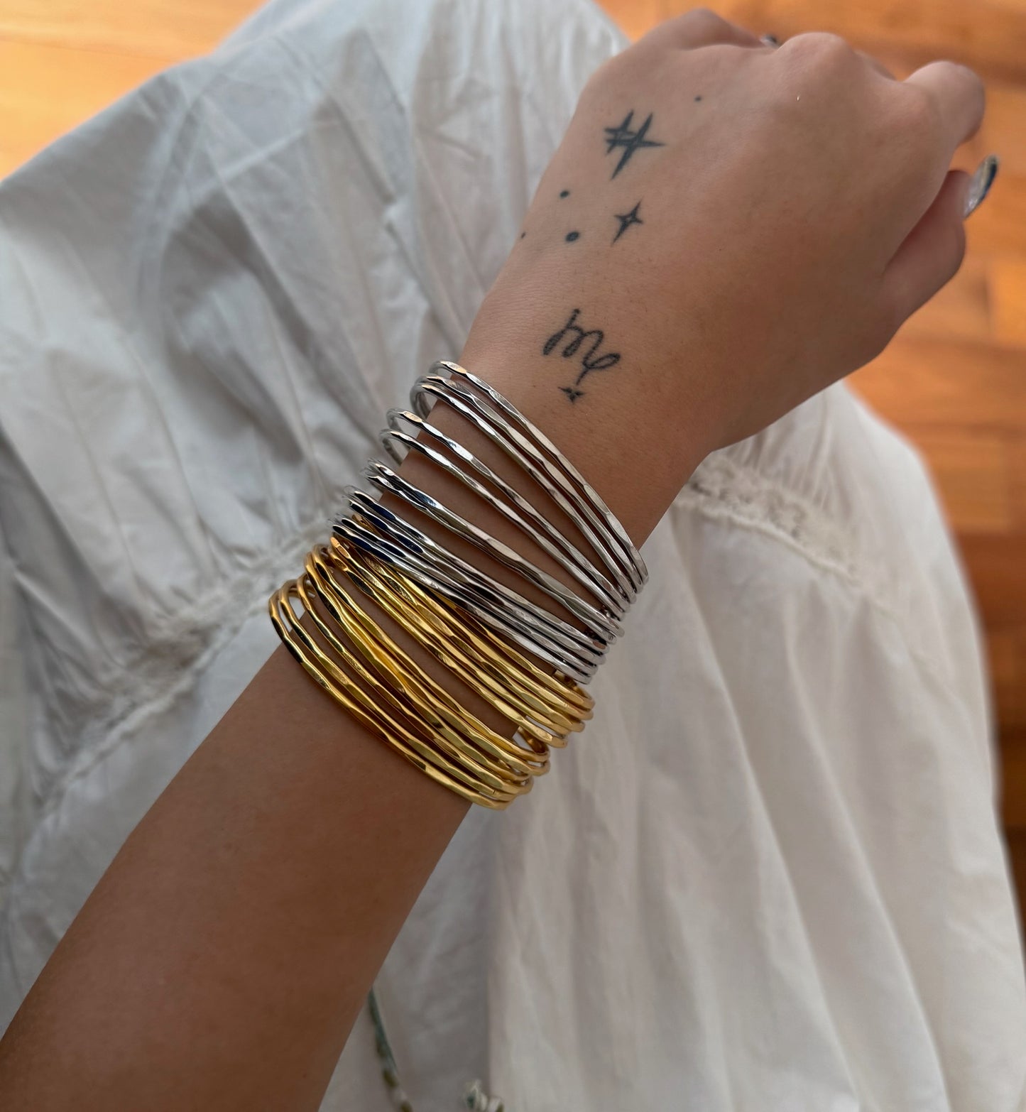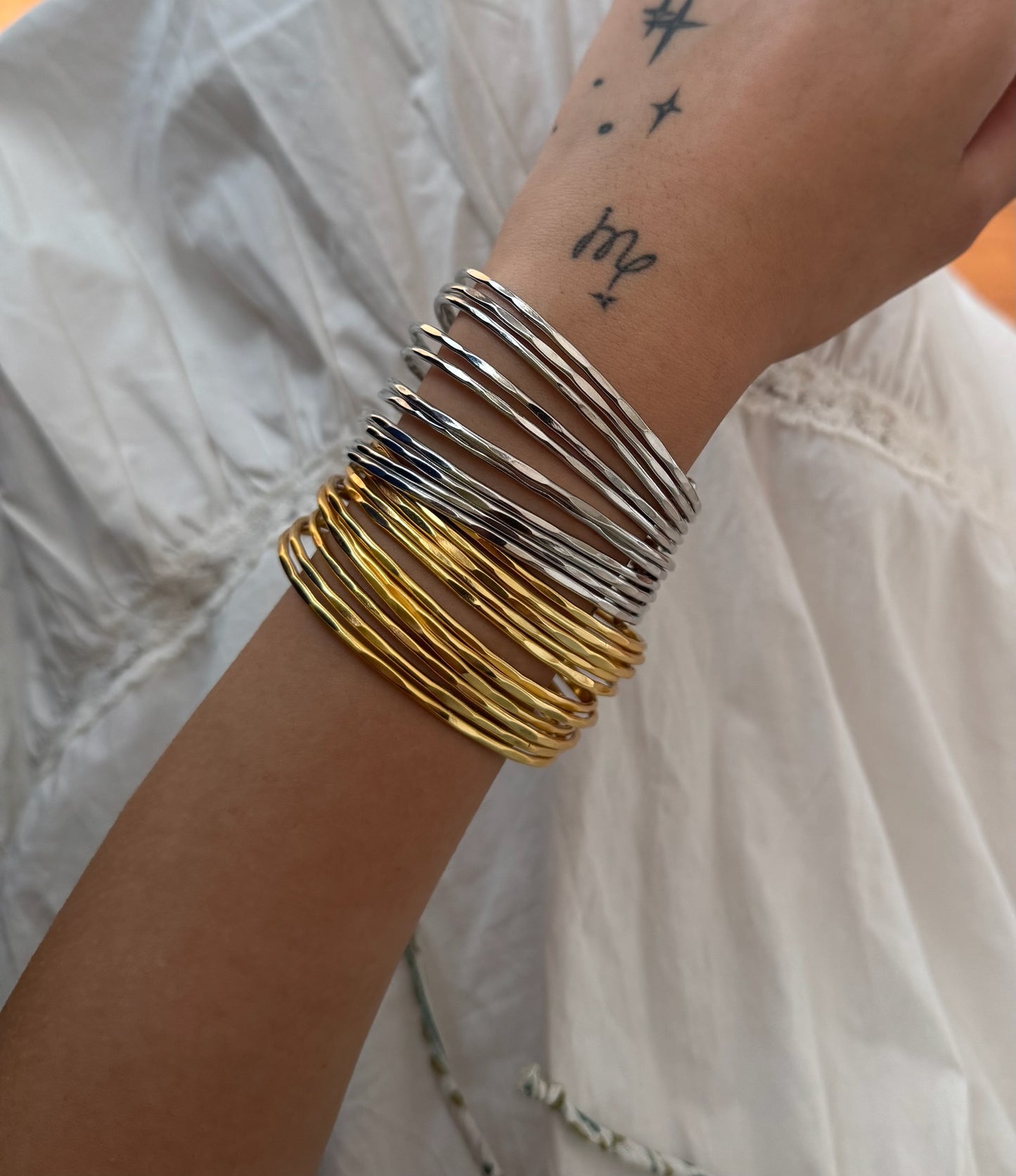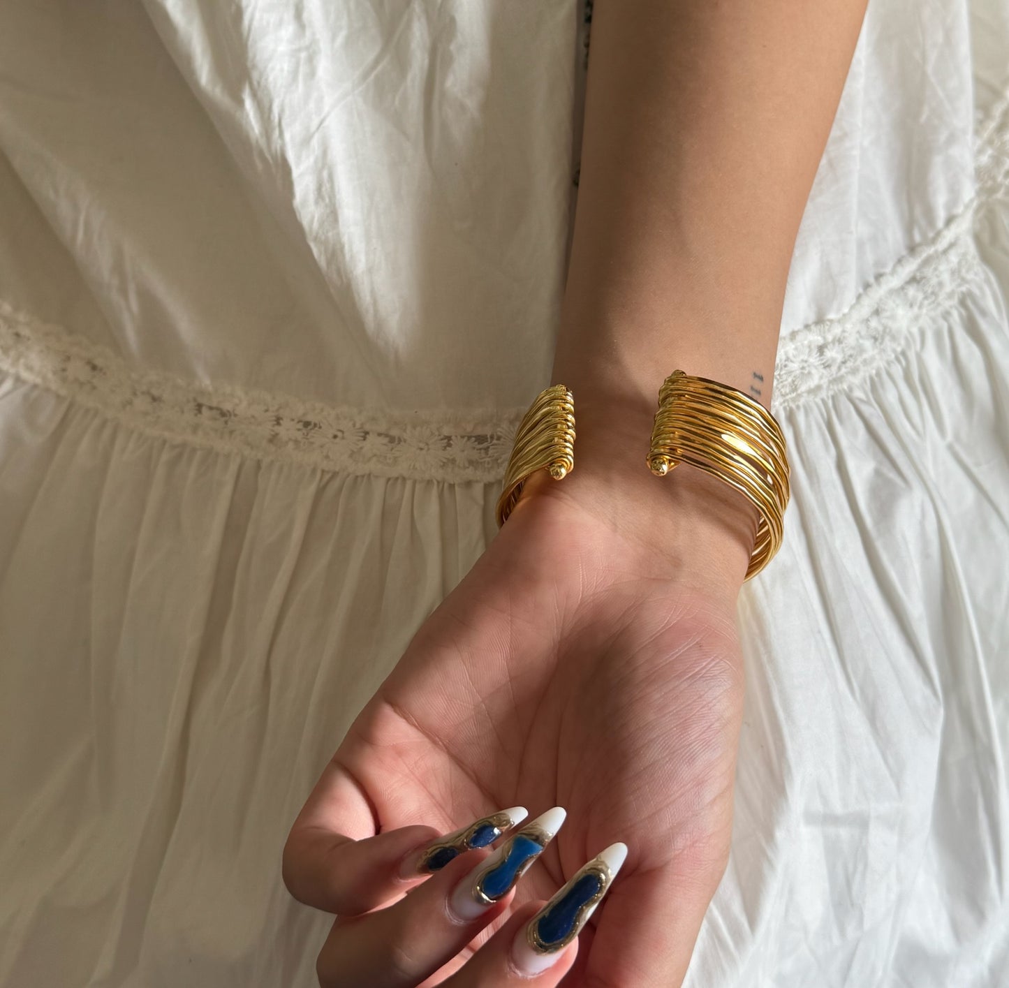 A timeless classic with a contemporary edge, the Lustre Bangles are a set of high-shine, gold-toned bangles that catch the light with every movement. Designed to be worn stacked or styled solo, they bring fluidity, boldness, and everyday elegance to your wrist.
