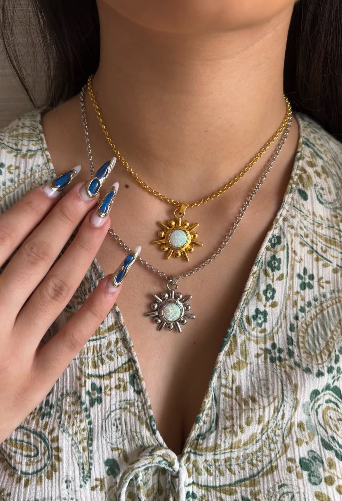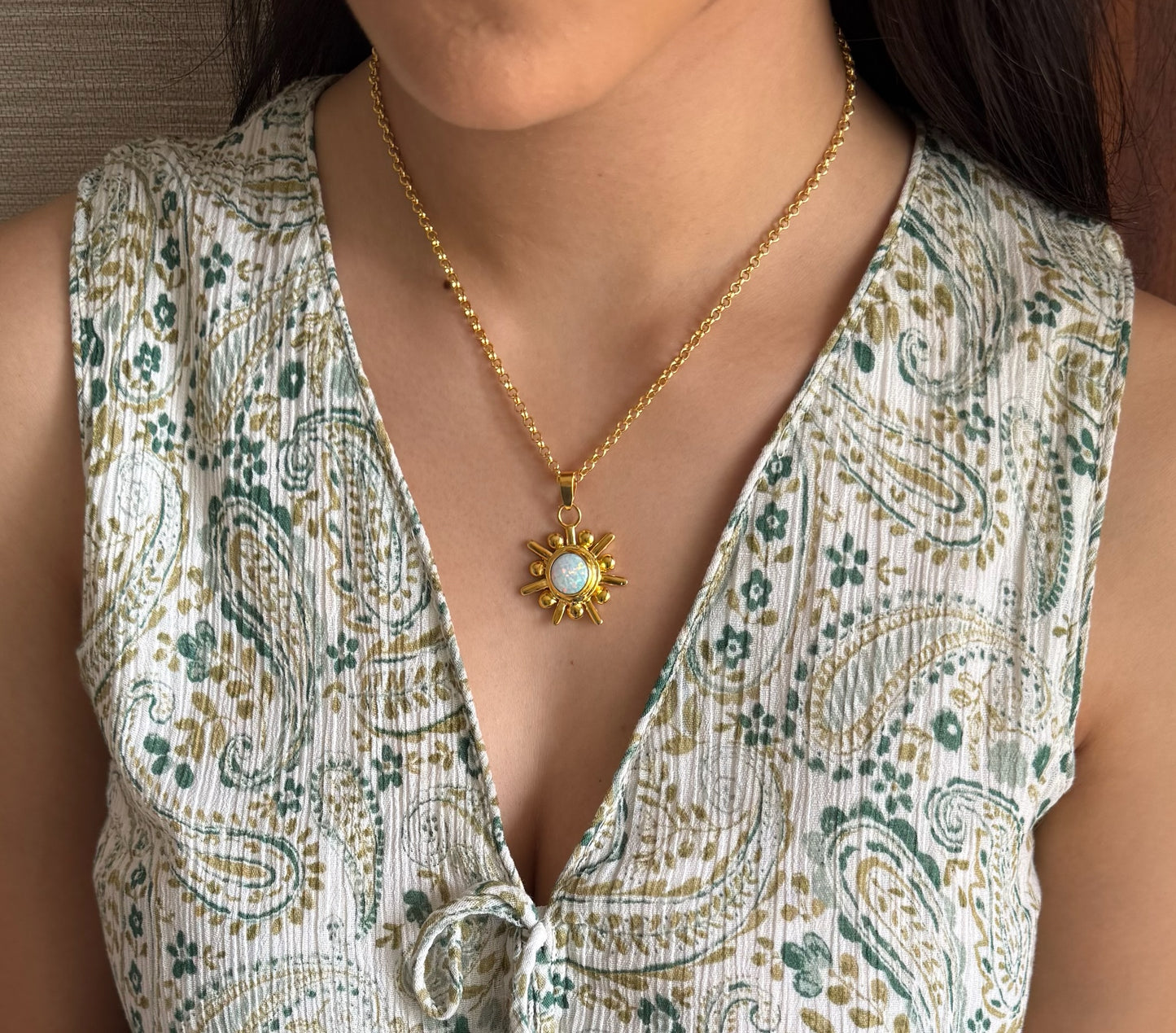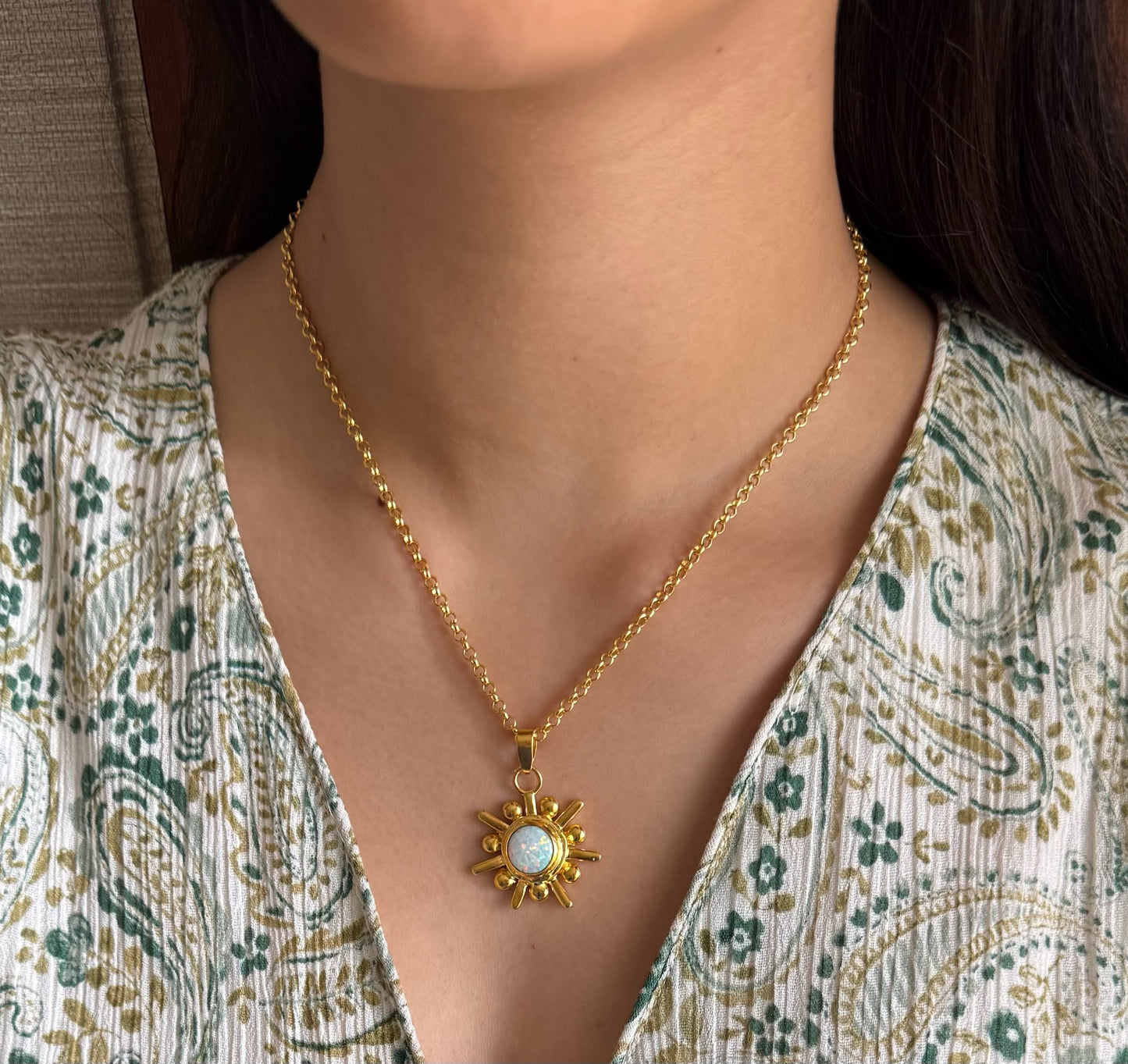A radiant ode to strength and self-assurance, the Opal Sun Necklace features a handcrafted sunburst pendant centered around a glowing opal stone. Bold yet refined, this piece captures the light within—designed for those who move through the world with quiet power.
