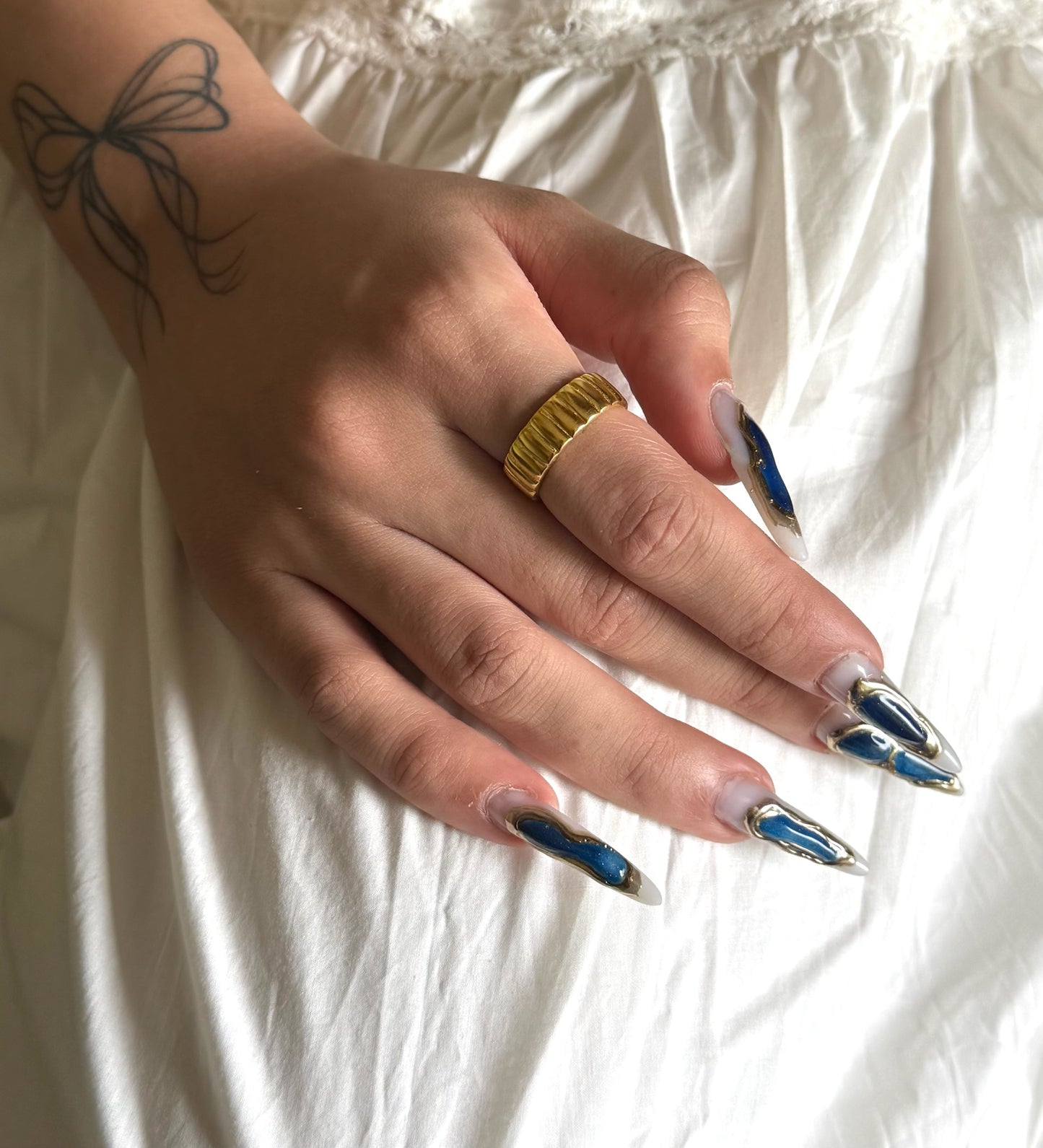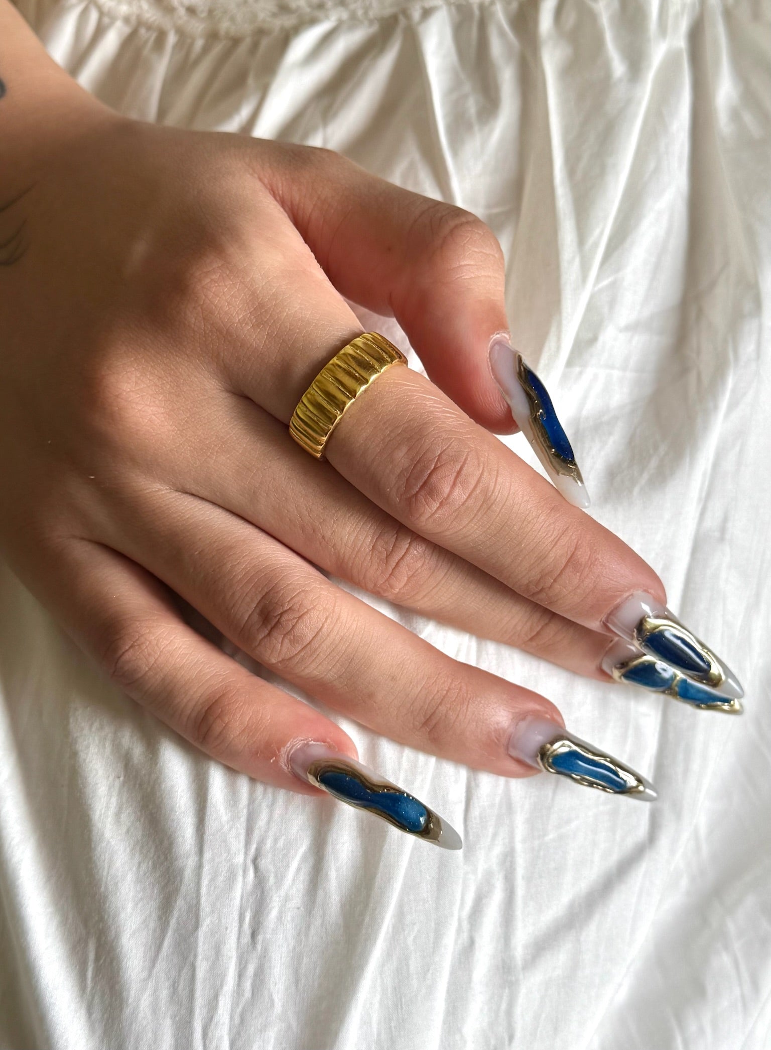 The Ripple Band Ring is a study in movement and form. Defined by soft vertical ridges that flow across the surface, this sculpted band catches light from every angle—striking the balance between structure and fluidity.