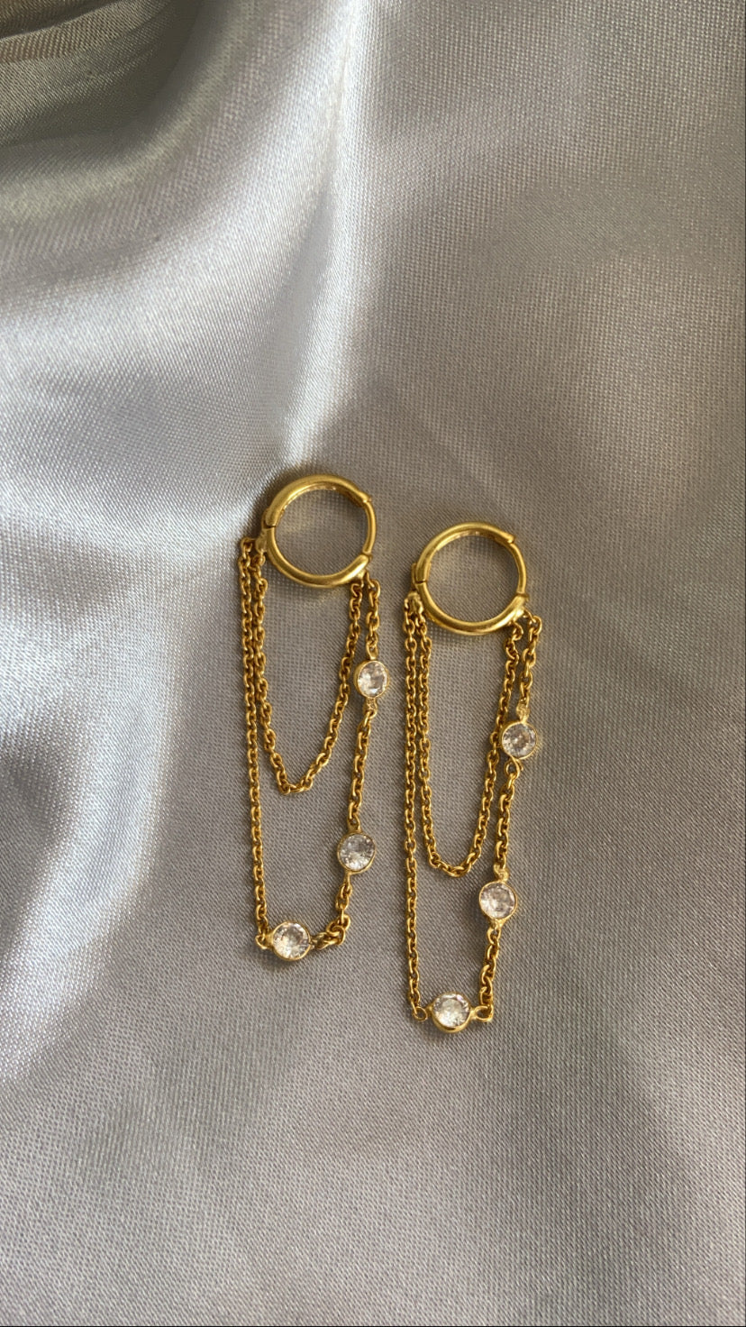 Our dainty studded chain huggies are perfect for your wfh meeting. Wear them solo or stack them up your way for an ear party! These minimal earrings are beautifully handcrafted in brass, plated with 18kt gold and studded white American diamond.