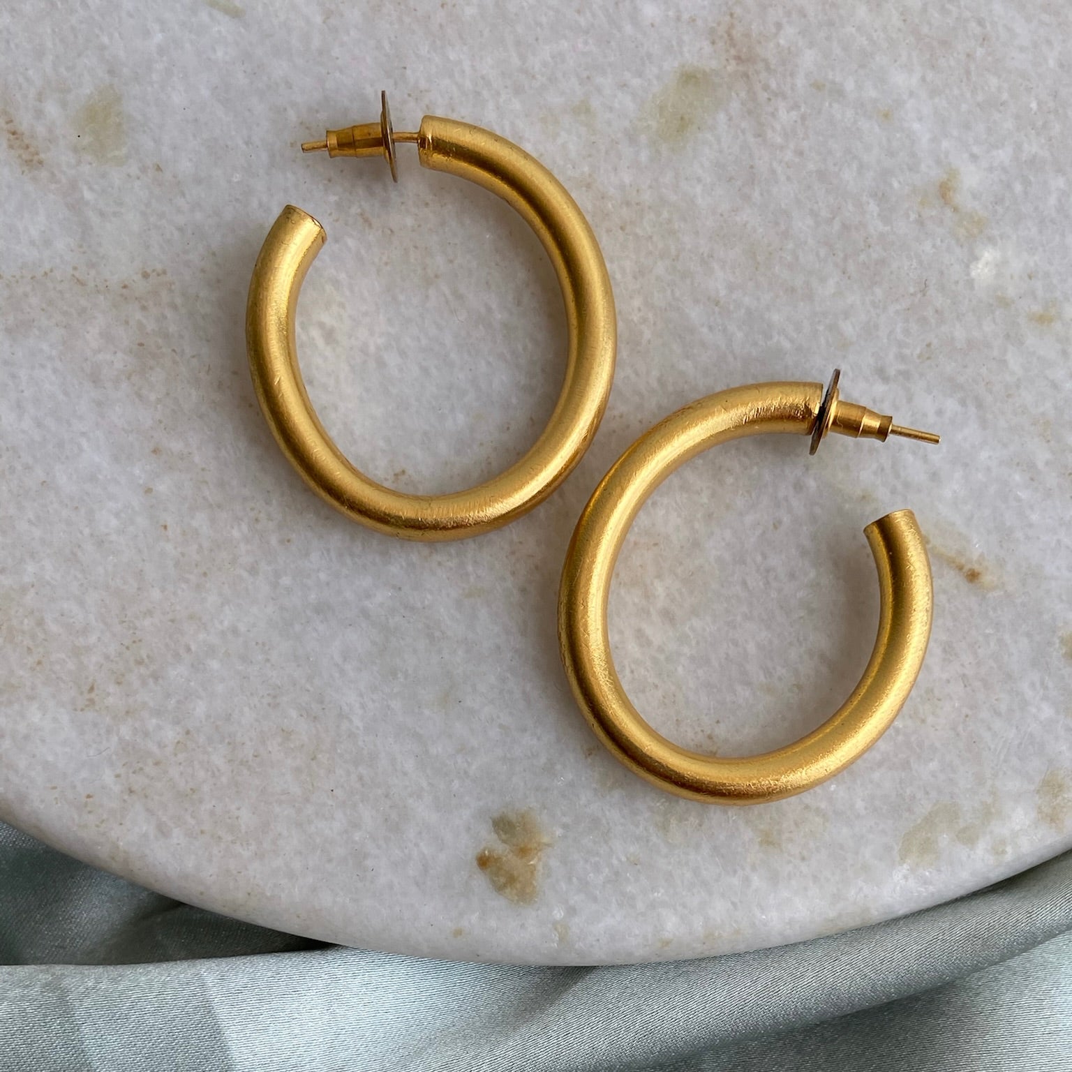 The brass construction ensures durability, while the radiant 18kt gold plating adds a touch of opulence. The warm golden hue of the earrings exudes elegance, enhancing your overall look with a touch of glamour. Whether you're dressing up for a special occasion or simply elevating your everyday attire, these hoops are the perfect finishing touch.