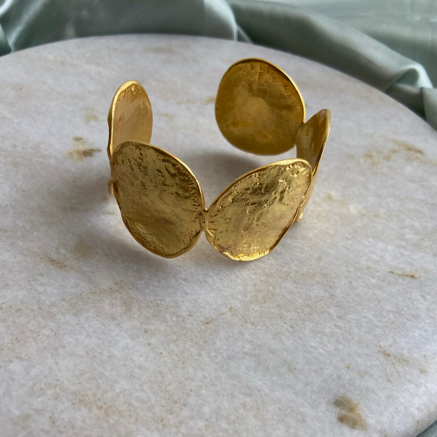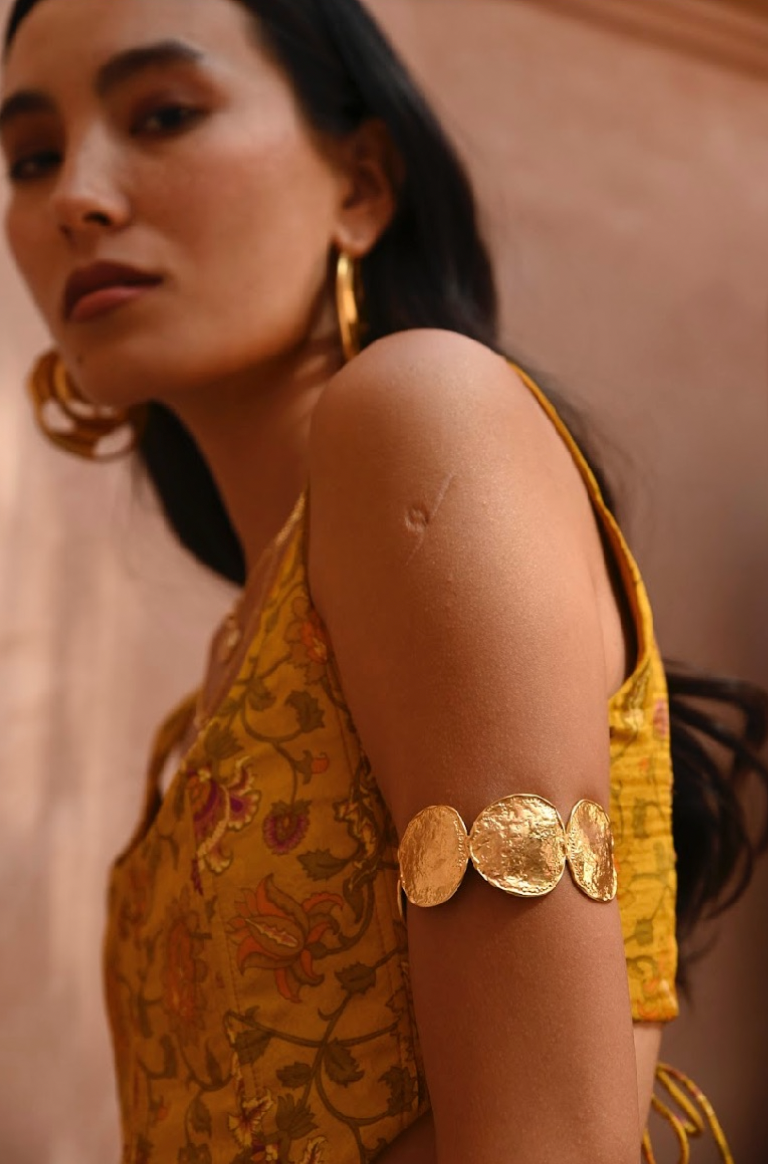 Crafted with utmost care and attention to detail, our Coin Bangle is made from high-quality brass and delicately plated with 18kt gold, creating a luxurious and radiant finish. Each coin-inspired element is meticulously handcrafted, showcasing the artistry and expertise of our skilled artisans.