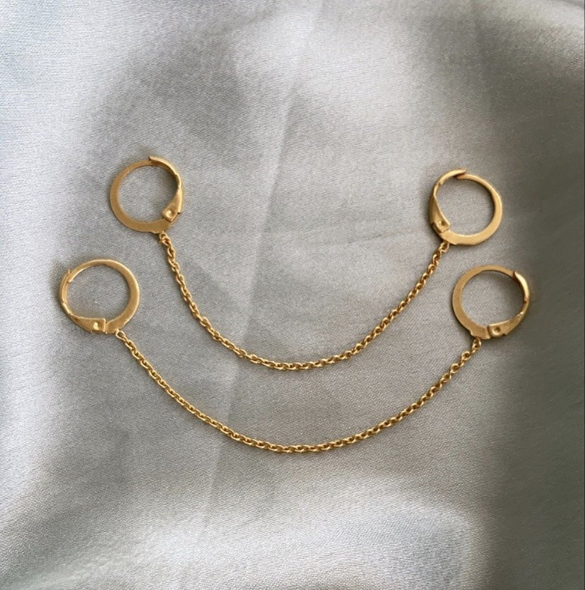 Want to keep a chic and minimal ear stack for your everyday lounge and work from home look? Our double chain huggies are for you! We know you've been looking for an earring for your second piercing for the longest time, this one is a no brainer. Made in brass, plated in 18kt gold.