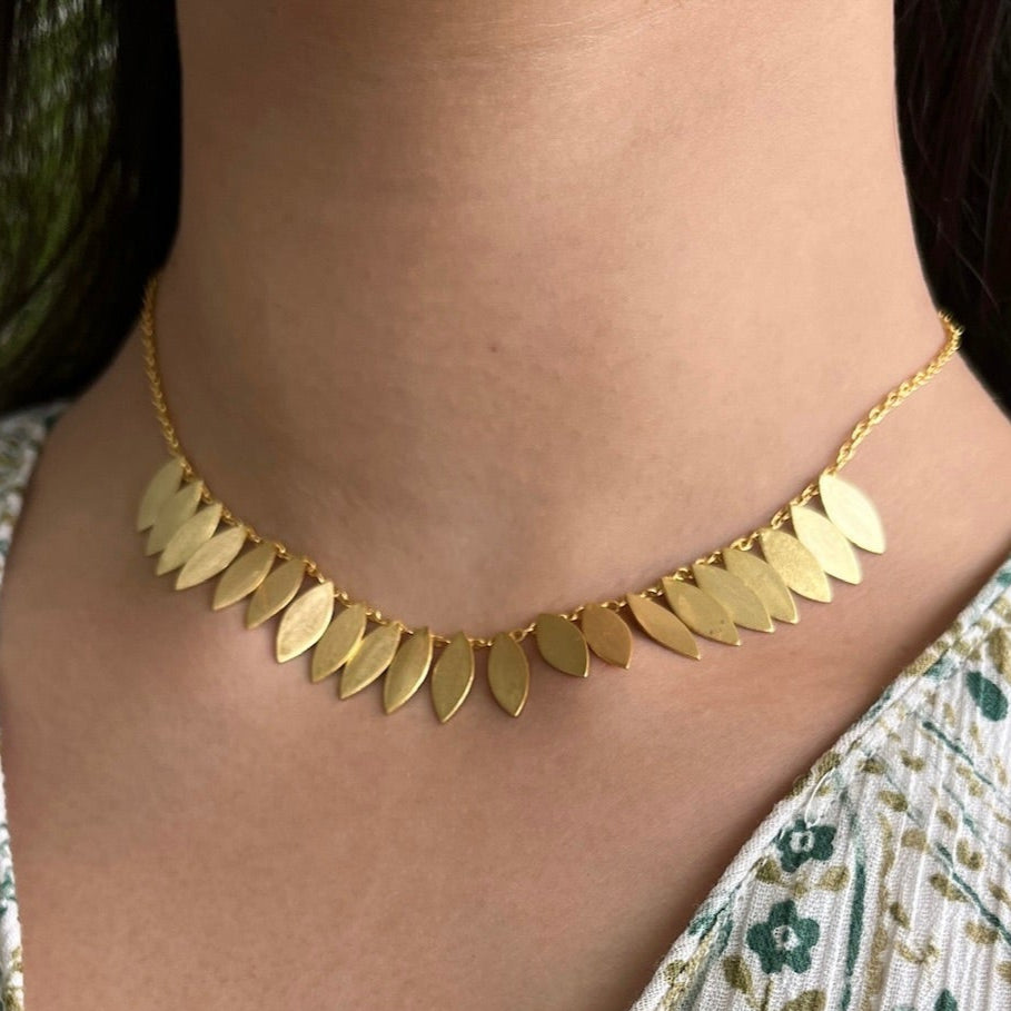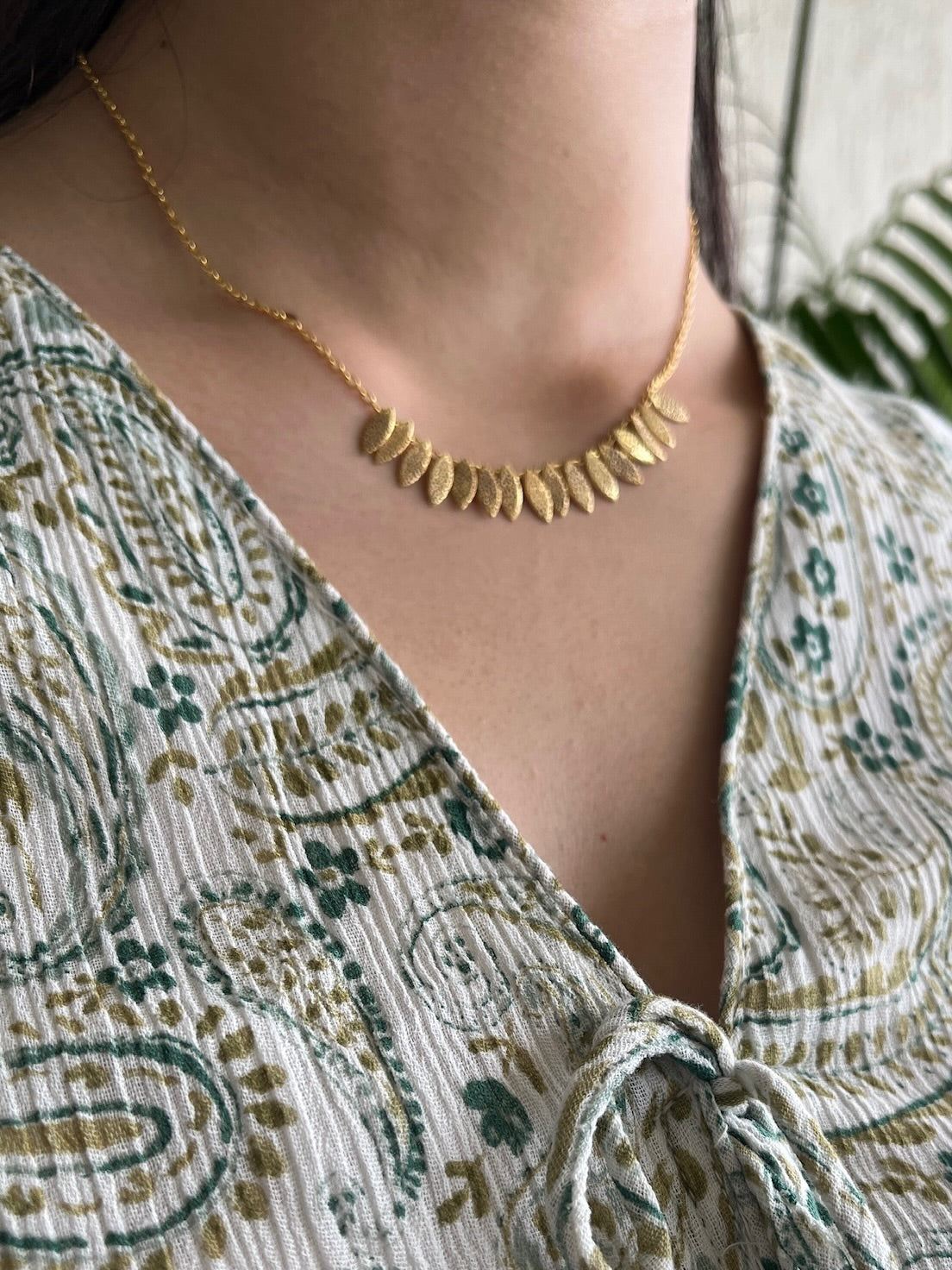 Inspired by natural forms, the Grain Collar Necklace features a row of textured gold-toned motifs that resemble grains or leaves—sculpted, matte-finished, and perfectly balanced along the neckline. This piece evokes quiet strength and earthy elegance, offering a unique blend of softness and structure.