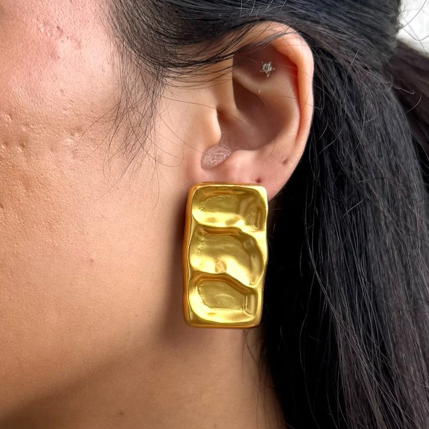 The Molten Block Earrings are an ode to sculptural minimalism. Designed with a rectangular base and softly contoured surface, each piece reflects light like liquid gold—creating depth, drama, and quiet confidence. The high-gloss finish and fluid texture make it a striking choice for modern wardrobes.