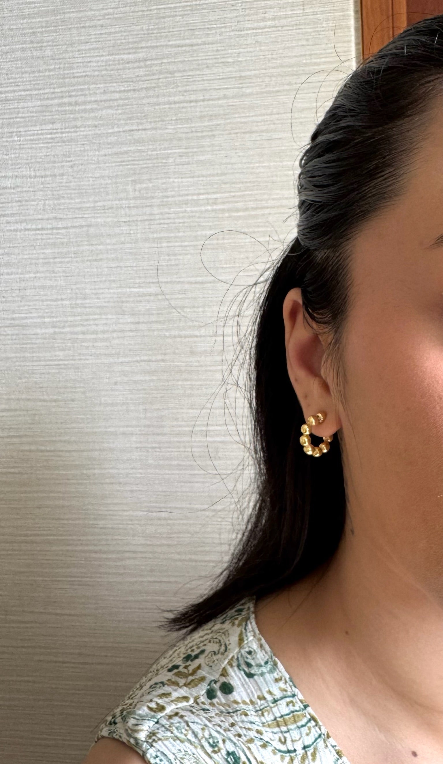 A playful twist on a classic silhouette, the Orbit Ball Hoops feature a structured arc of molten gold spheres that wrap the ear with texture and movement. Their compact shape makes them perfect for everyday wear, while the bold clustered form adds sculptural edge.