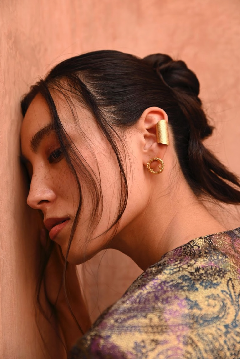 Crafted from high-quality brass and plated with 18kt gold, this ear cuff beautifully combines the rustic charm of a nomadic era with contemporary design elements. The chunky texture adds a sense of boldness and confidence, while the intricate details showcase the artistry of our artisans.