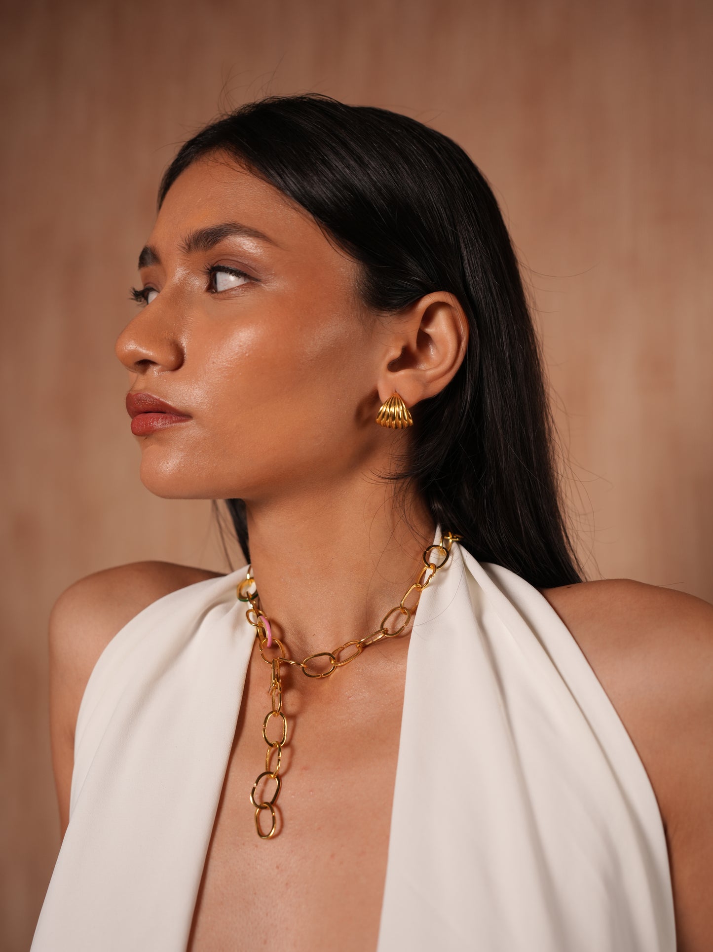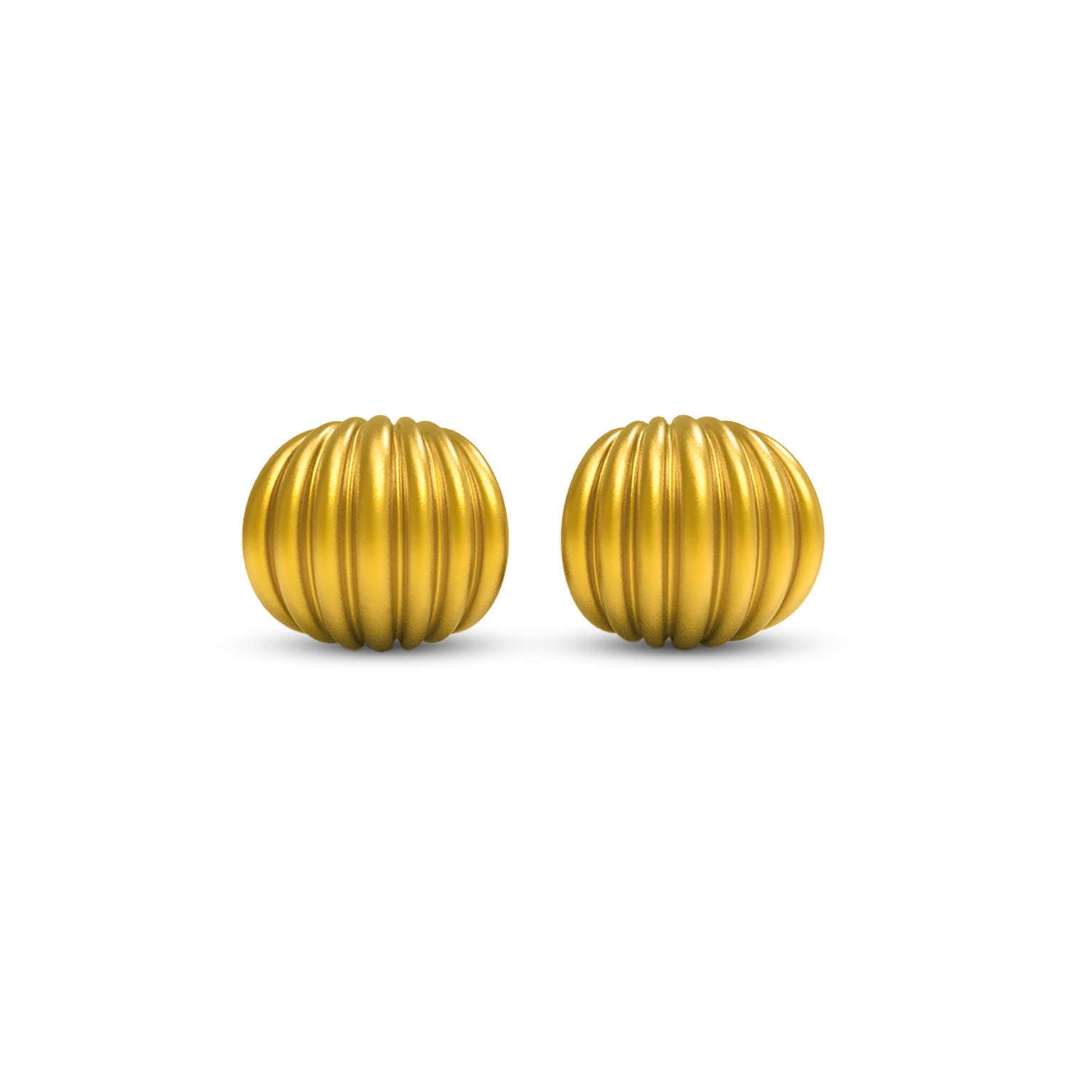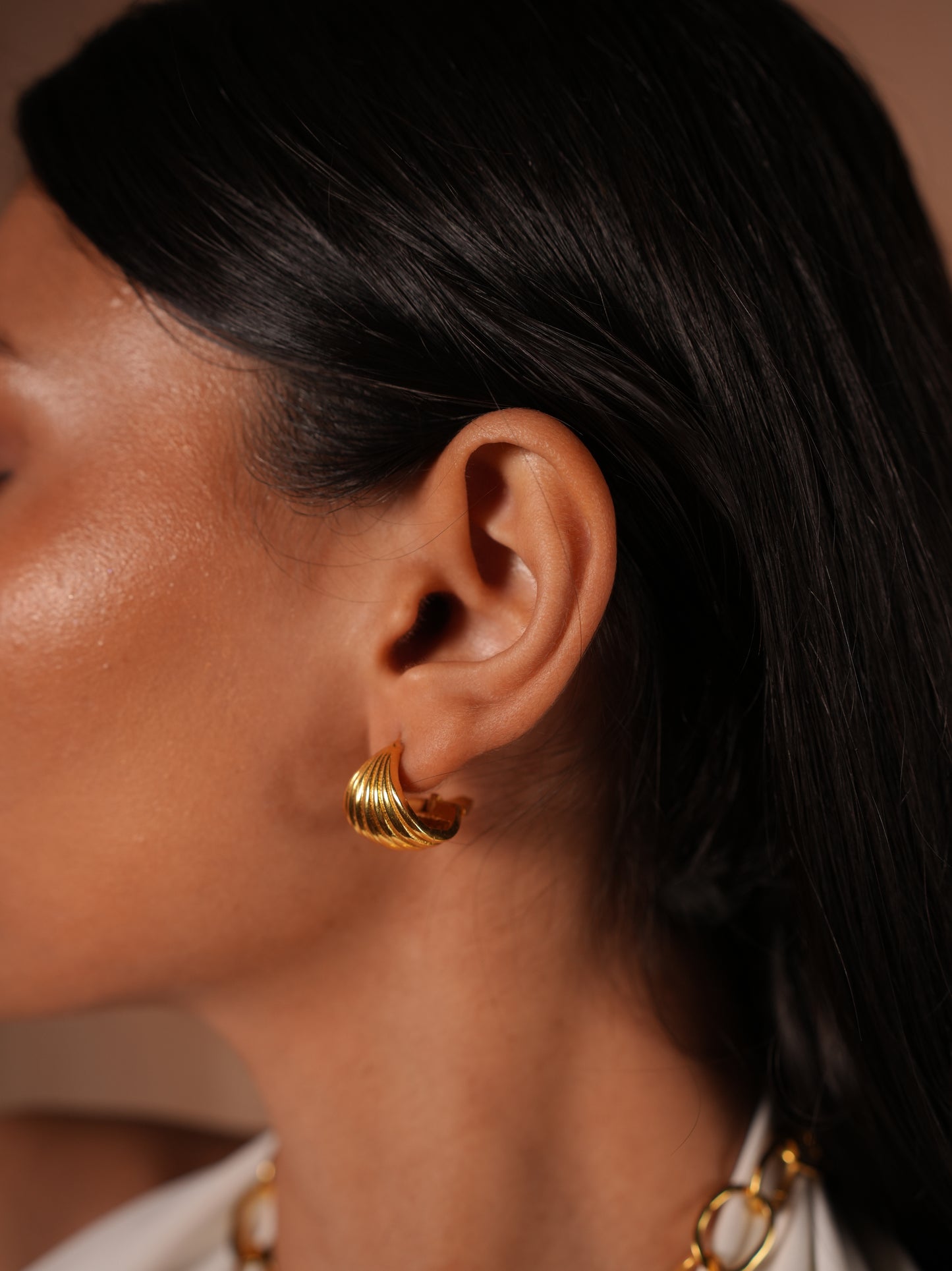 These elegant huggie earrings are expertly crafted from high-quality brass with a luxurious 22kt gold plating, offering a rich, matte finish that radiates sophistication. The beautifully curved, ridged design adds texture and dimension, creating a timeless yet modern aesthetic. The earrings feature a secure clasp, ensuring a comfortable fit for everyday wear or special occasions. Finished with a protective E-coating, they are resistant to tarnish, ensuring long-lasting durability and brilliance. Perfect for those who appreciate refined yet statement-making jewelry, these earrings add a touch of effortless elegance to any outfit.