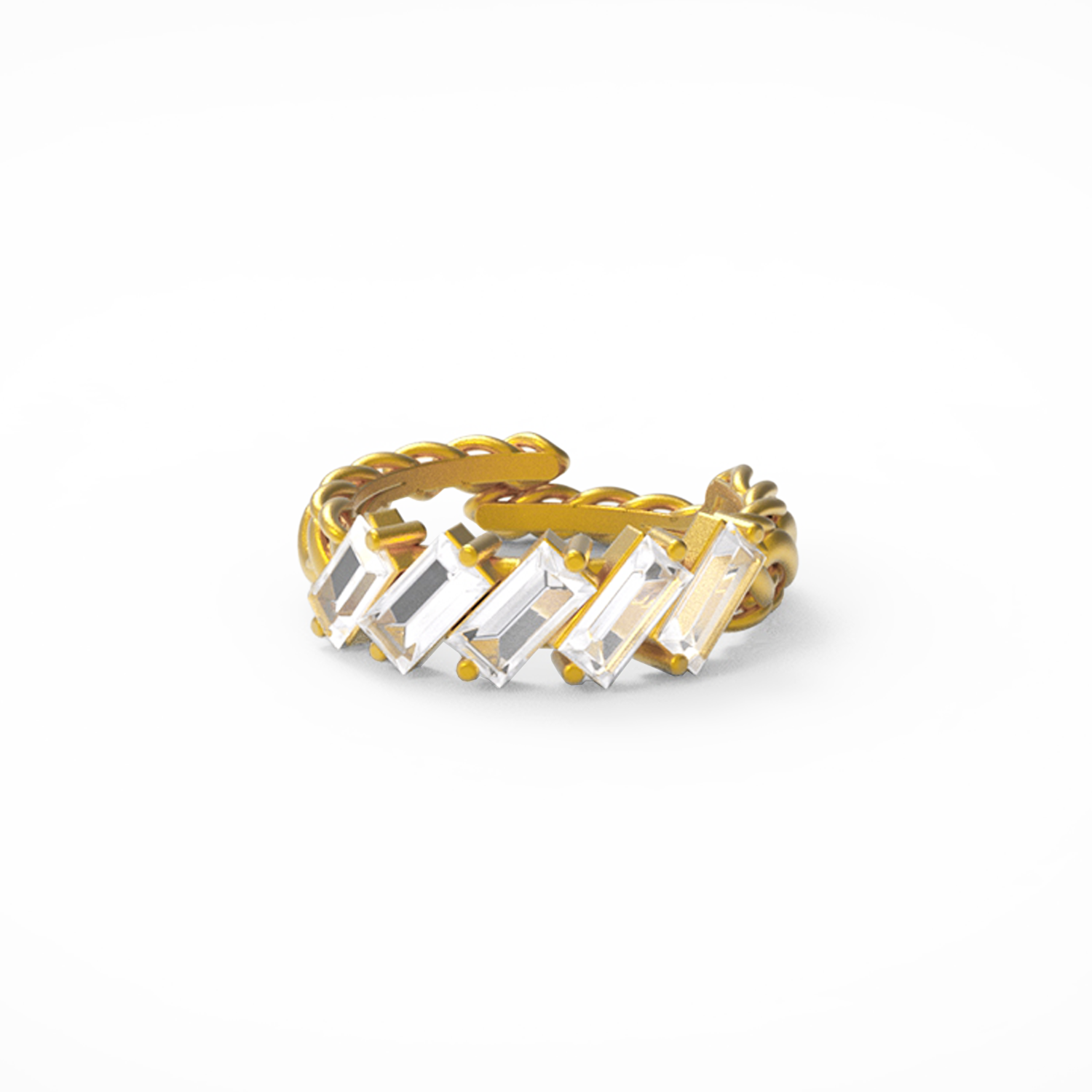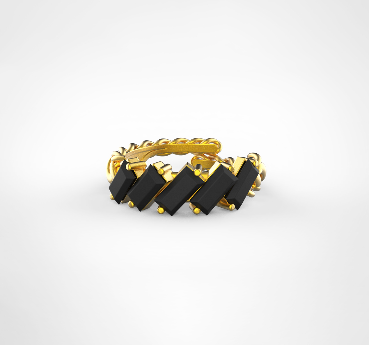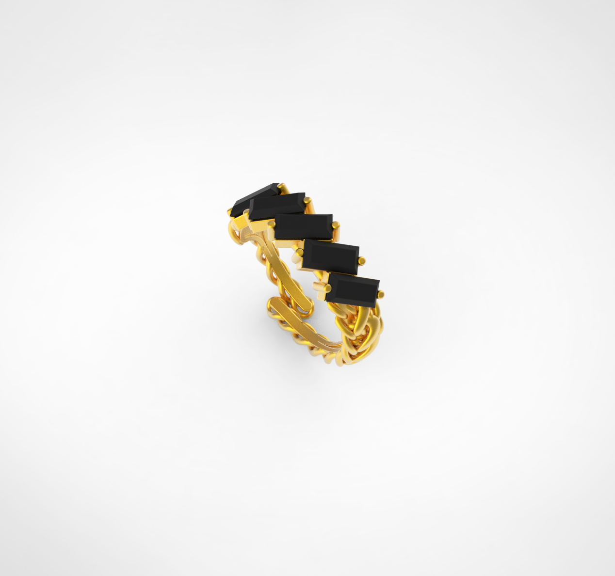 This elegant jewelry piece is a beautifully crafted ring, made from high-quality brass and coated with luxurious 22kt gold plating. The ring showcases a row of sleek, black baguette-cut stones that create a striking contrast against the warm gold tone. Its contemporary design combines minimalist aesthetics with a touch of bold sophistication, making it a versatile accessory for both casual and formal occasions. Perfect for those who appreciate fine craftsmanship and timeless elegance, this ring is a statement of understated luxury and modern style.
