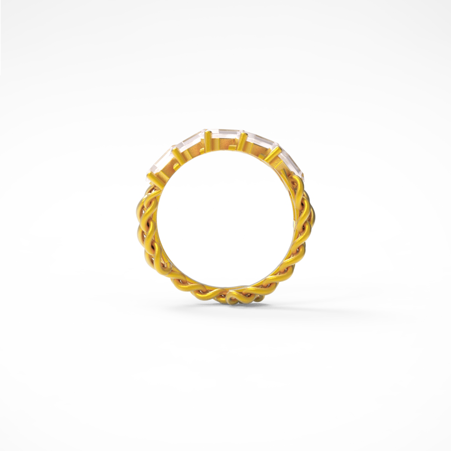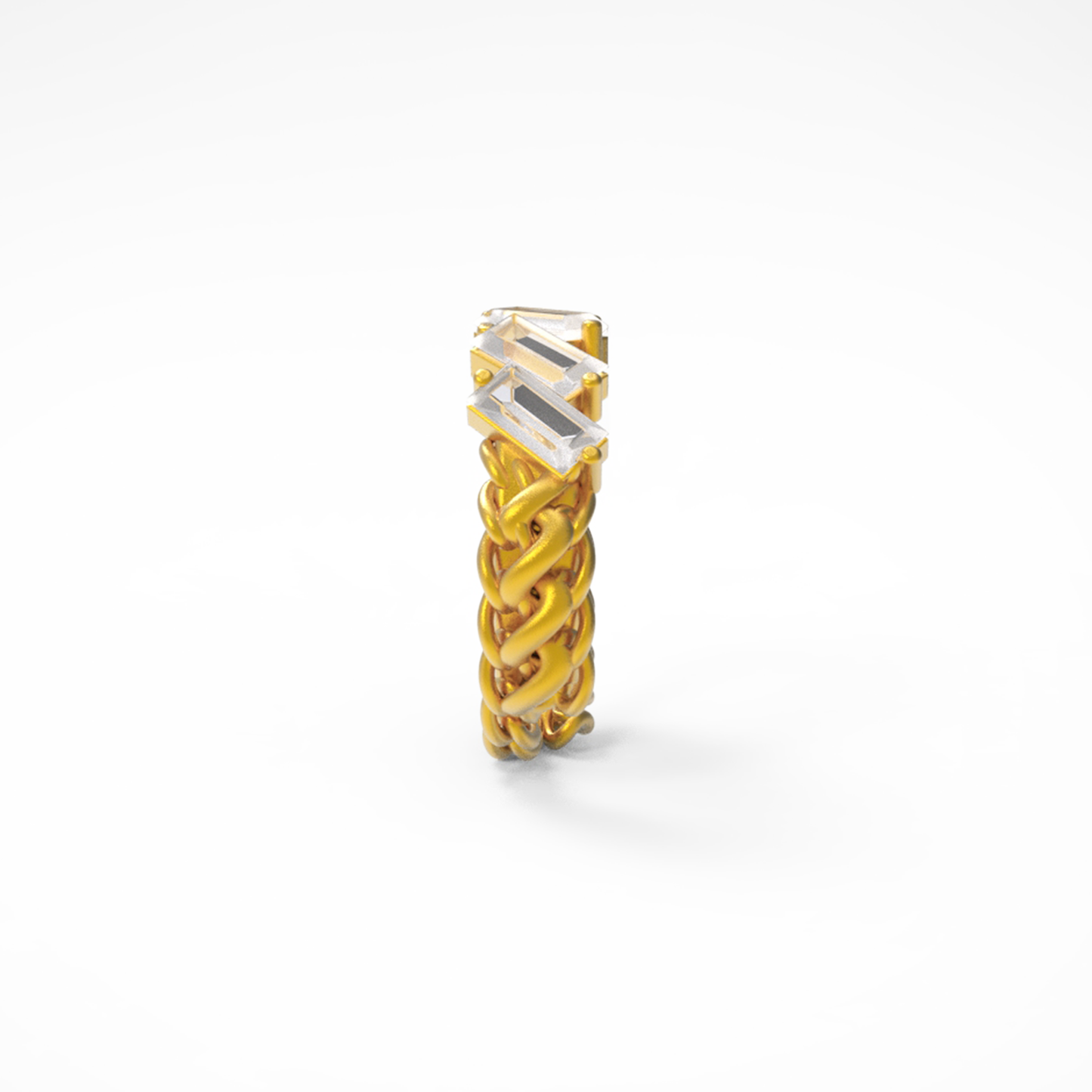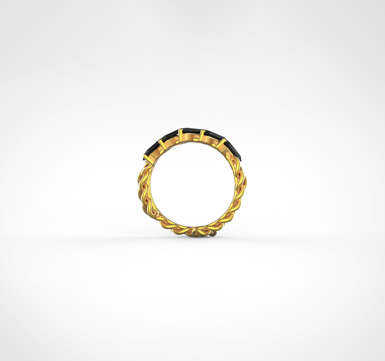 This elegant jewelry piece is a beautifully crafted ring, made from high-quality brass and coated with luxurious 22kt gold plating. The ring showcases a row of sleek, black baguette-cut stones that create a striking contrast against the warm gold tone. Its contemporary design combines minimalist aesthetics with a touch of bold sophistication, making it a versatile accessory for both casual and formal occasions. Perfect for those who appreciate fine craftsmanship and timeless elegance, this ring is a statement of understated luxury and modern style.