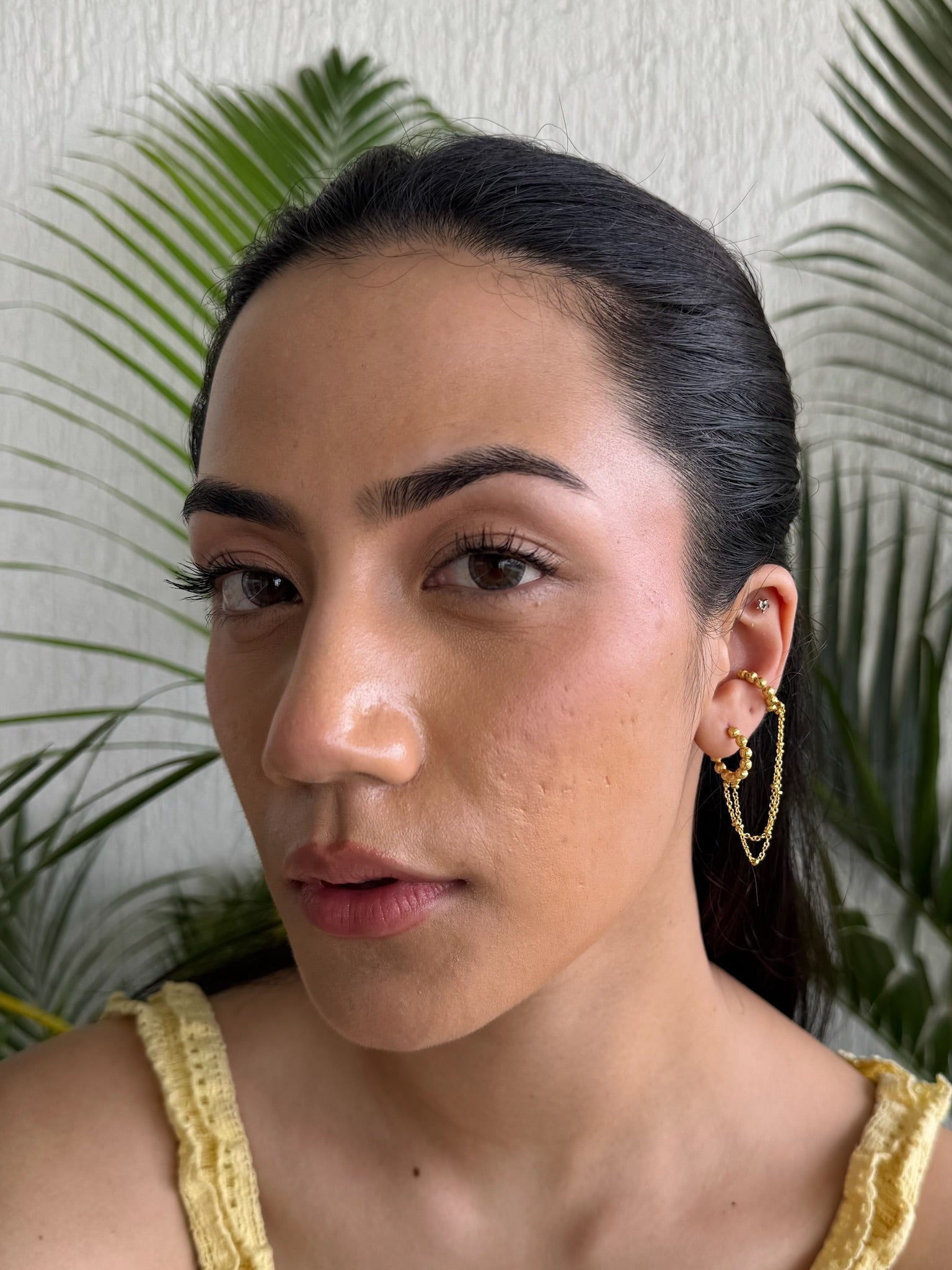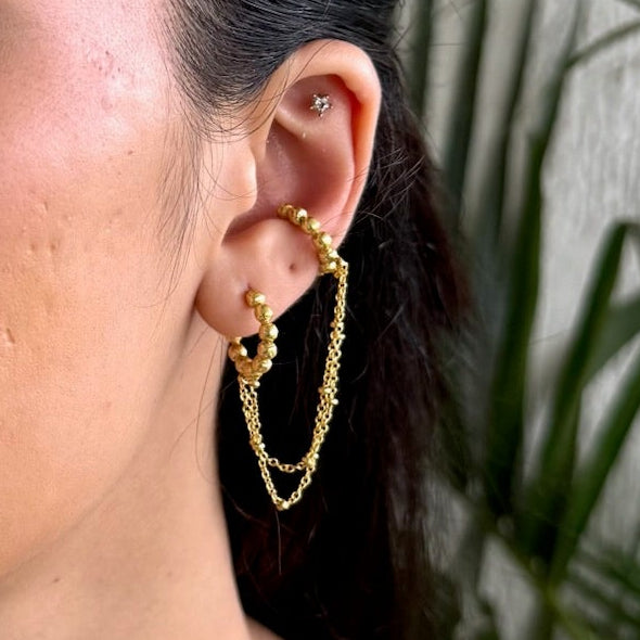 The Beaded Cuff Earring blends structure and fluidity in a silhouette that wraps the ear with sculptural elegance. Featuring a beaded stud connected to a polished gold cuff by draped chains, this piece creates the illusion of multiple piercings—without requiring one for the upper cuff.