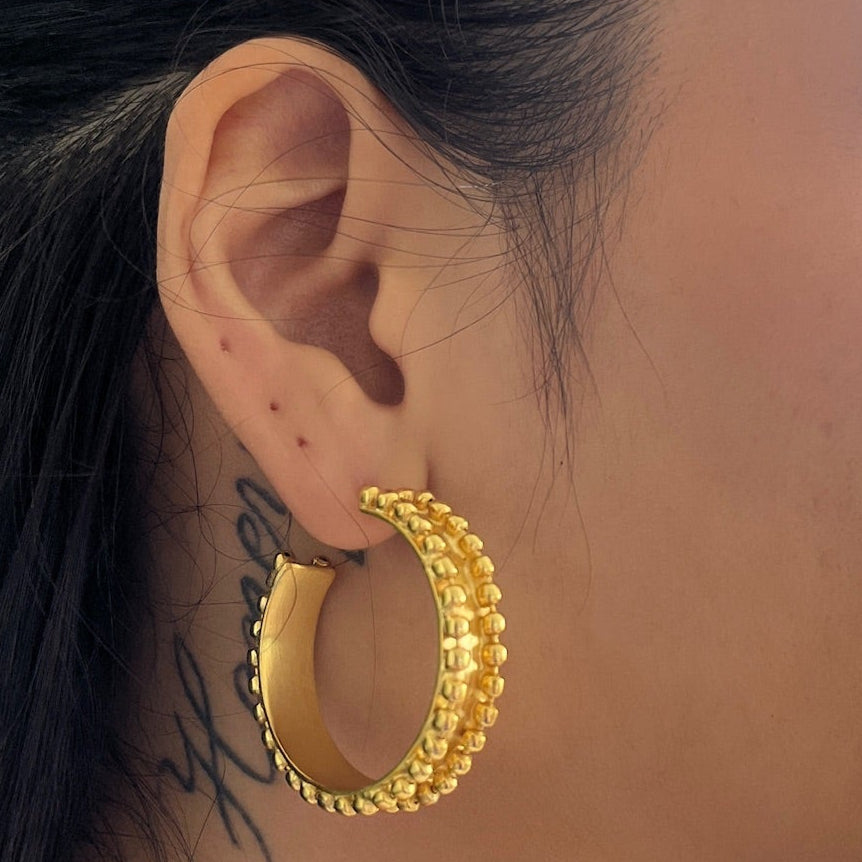 Bold yet refined, the Beadline Hoops (Large) feature a sculptural crescent form accented with raised gold beads along the outer curve. Their clean profile and rhythmic texture bring a striking sense of movement and balance—designed to make a statement without overpowering.