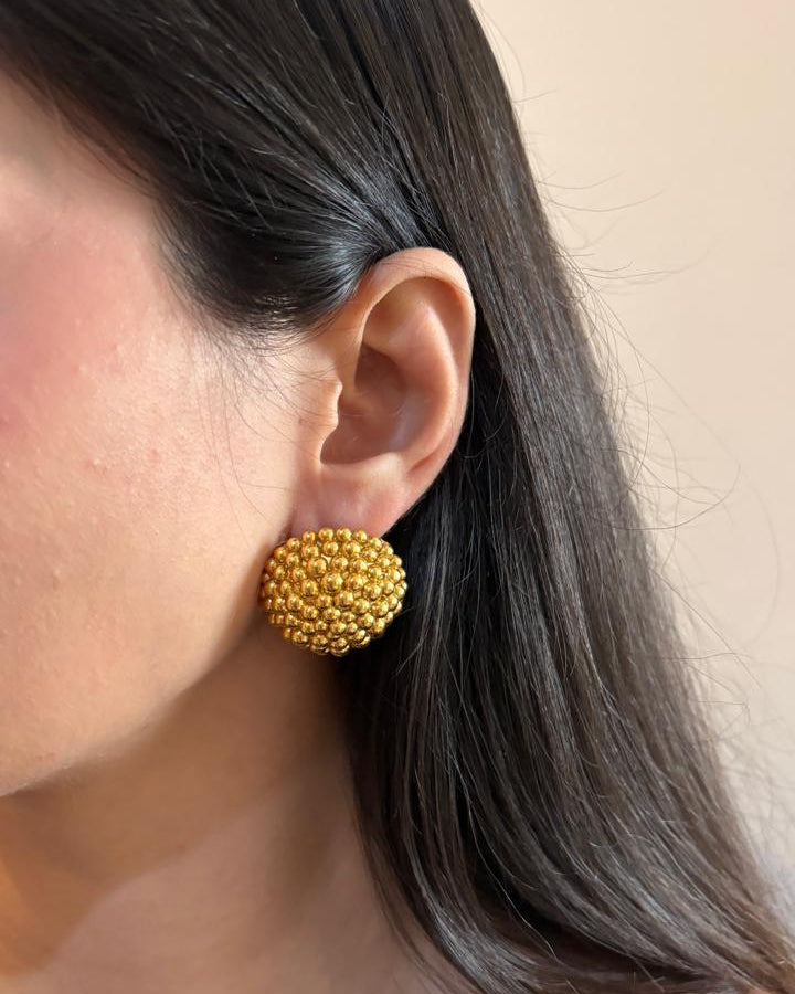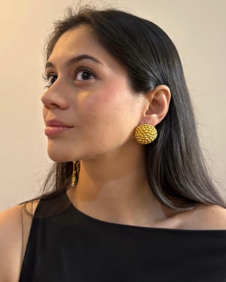 Inspired by the golden droplets of the beloved Indian sweet, The Boondi Tops are a masterclass in texture and form. These statement studs feature a voluminous, domed silhouette entirely covered in raised metallic granules, creating a mesmerizing play of light that mimics the look of raw gold nuggets or vintage caviar jewelry.