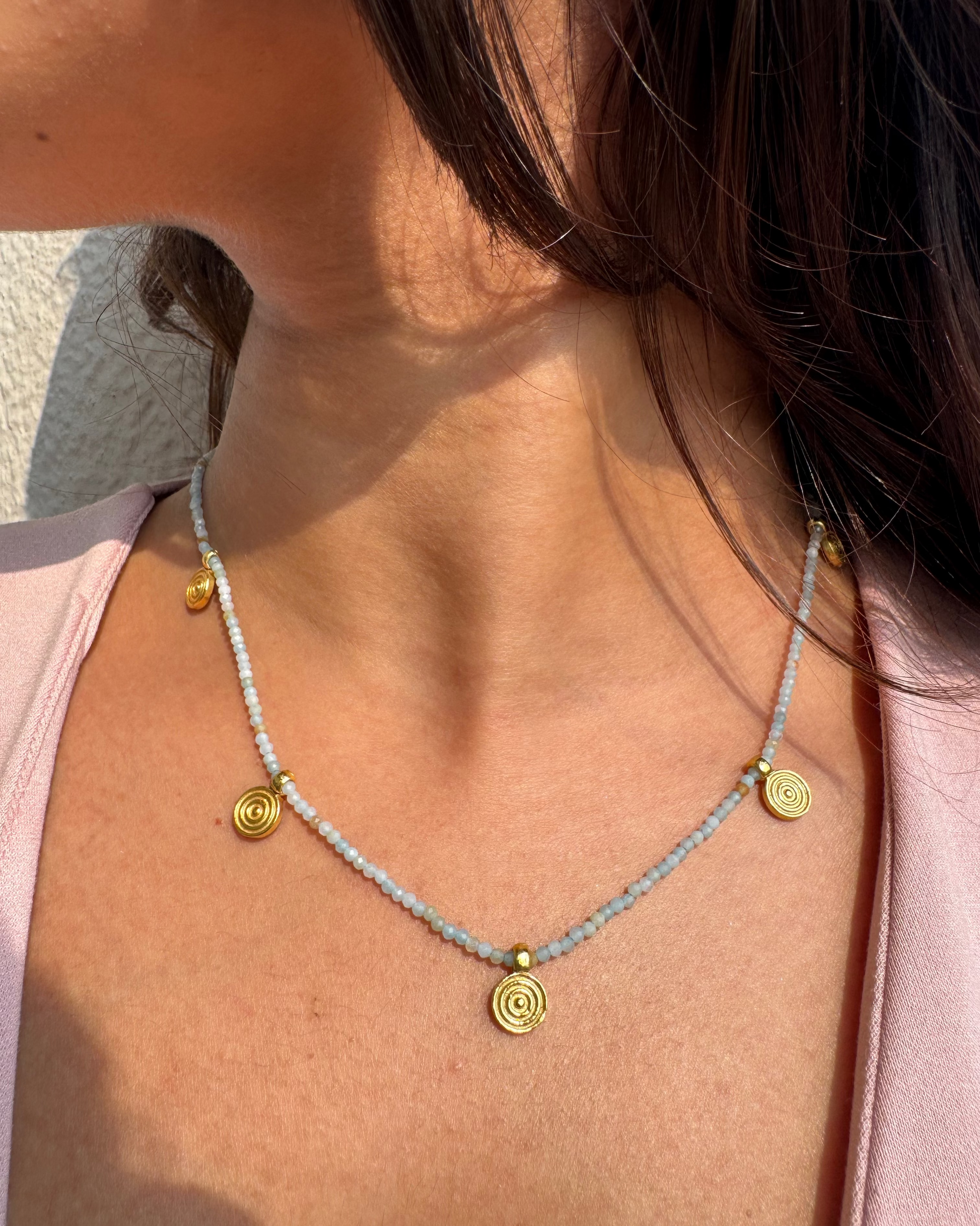 The Mini Sun Charm Beaded Necklace features a strand of soft micro-beads accented with small gold sun-inspired charms spaced gently along the necklace. Each charm carries a textured, radiant form that catches light softly as it moves. The evenly placed charms create a balanced rhythm across the strand, giving the piece a playful yet refined presence.