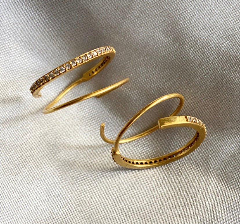 Always wanted double piercing but never got one? Our imitation studded double piercing hoops are for you. Available in medium size.YES, you heard it right no need to get second piercing.These give you an illusion of second hoops. They’re perfect for you everyday minimal look. They’re made in brass, studded with cubic zircona plated in 18kt gold. Flaunt your second piercing without having one.