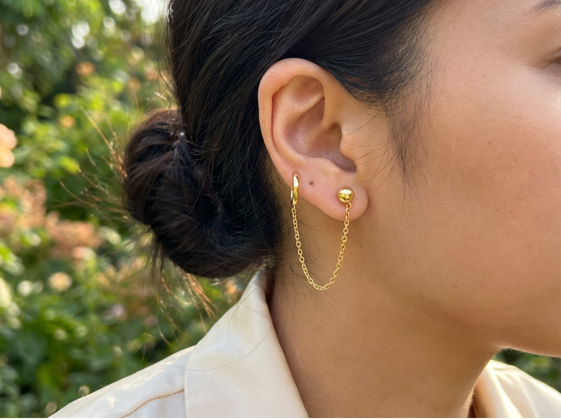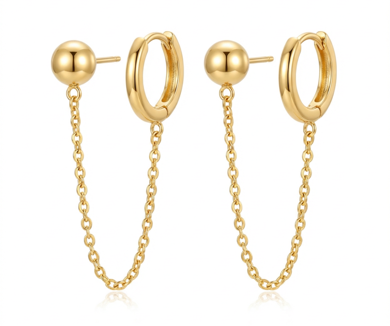 Where chain meets charm. The Linkdrop Earrings are designed for double piercings, connecting a bold golden ball stud to a high-polish oval link with fluid twin chains. Lightweight yet striking, they add a modern edge to your everyday rotation.