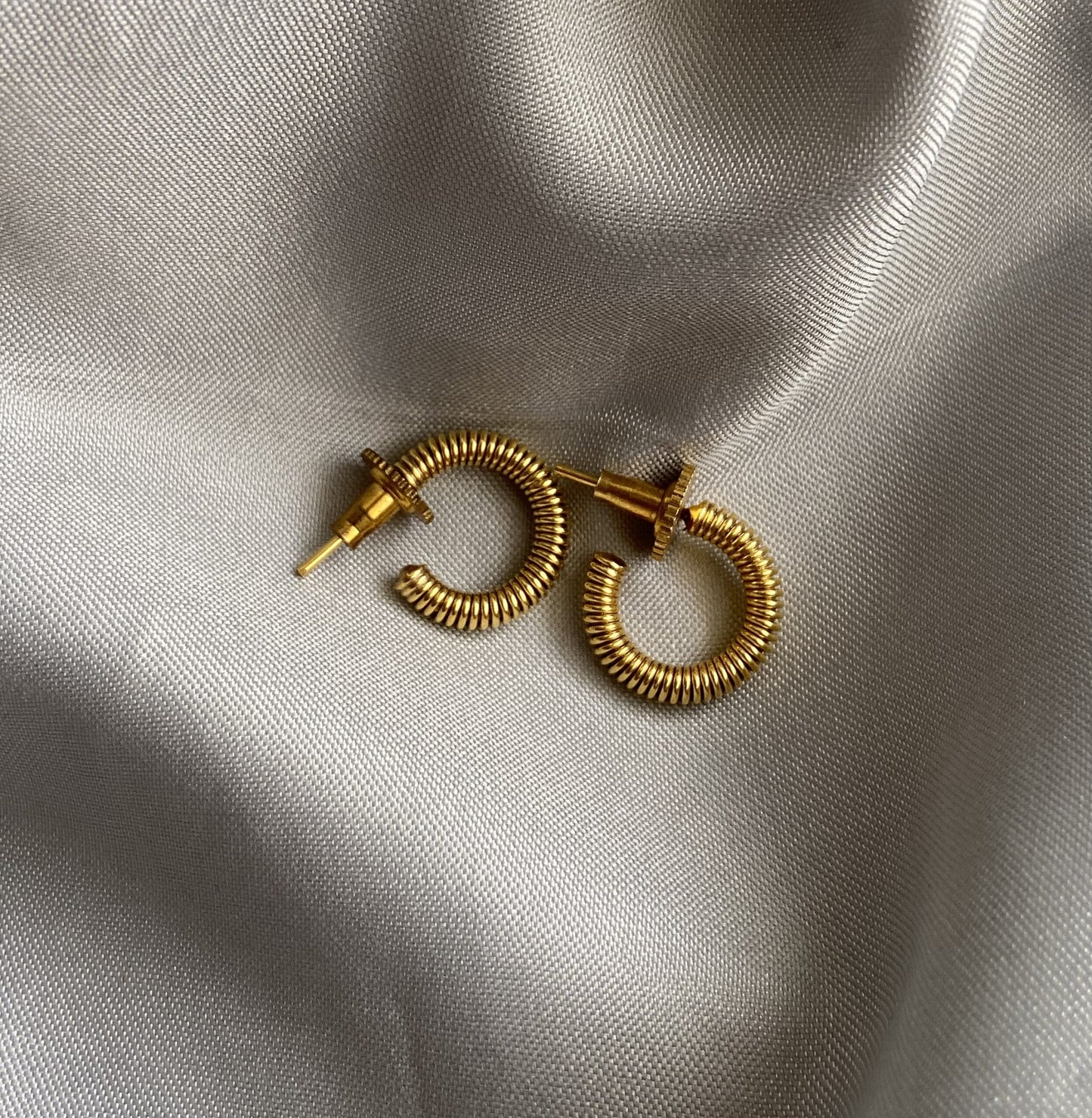 Looking for small regular hoops but different? our spring hoops are for you. They're perfect for second piercing when you want to stack them, or wear them solo for a smart basic look. They're made in brass, plated with 18kt gold.