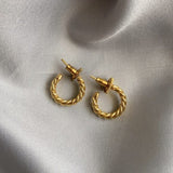 Looking for something dainty and cute? Our twisted mini hoops are for you. Perfect for everyday work meetings or to laze around in. Theyre made in brass, plated in 18kt gold.
