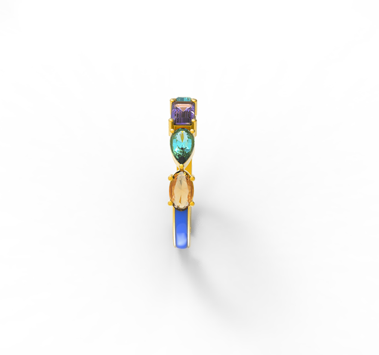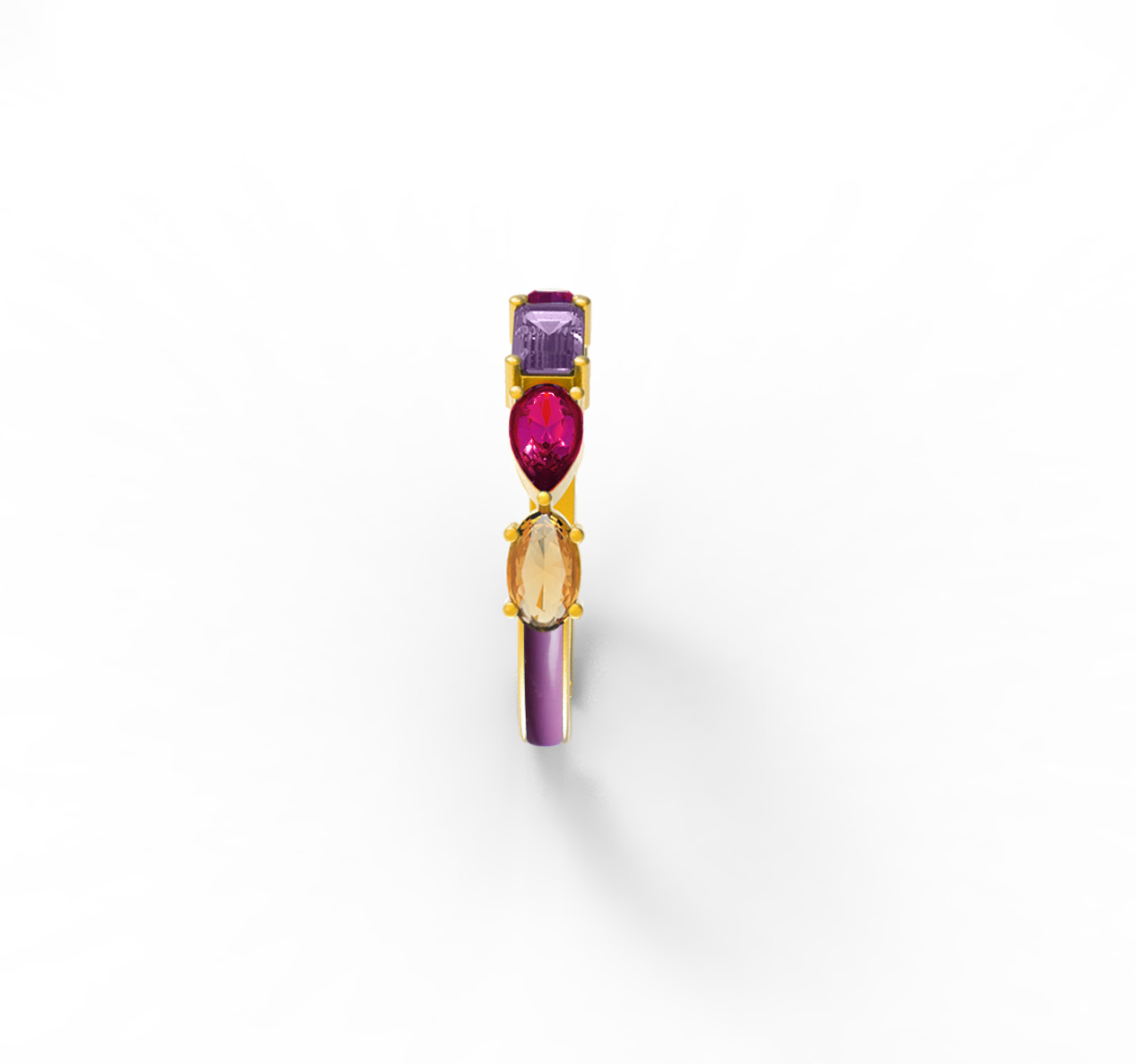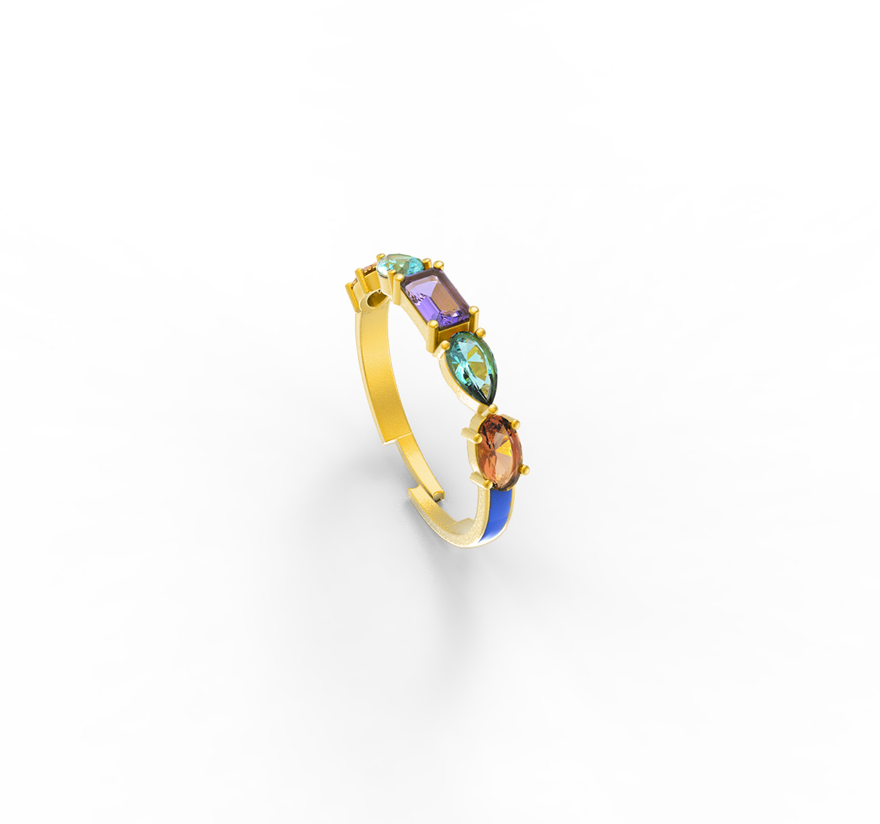 These vibrant and eye-catching rings are crafted from premium brass, coated with 22kt gold plating for a luxurious finish. Each ring features a delicate row of multicolored gemstones, creating a stunning rainbow effect that adds a playful yet elegant touch to any outfit. The combination of rich jewel tones and gold creates a dazzling contrast, perfect for making a bold statement. With a protective E-coating, these rings are designed to maintain their shine and resist tarnishing, ensuring durability. Wear them alone for a pop of color or stack them for a bolder look, making these rings versatile for any occasion.