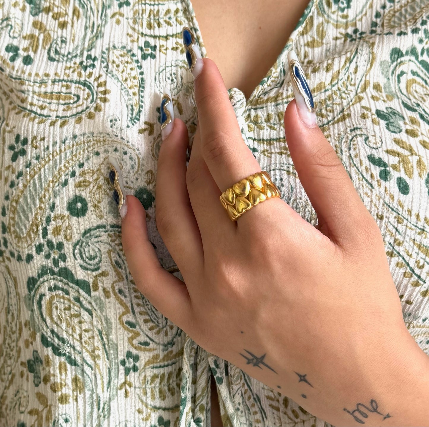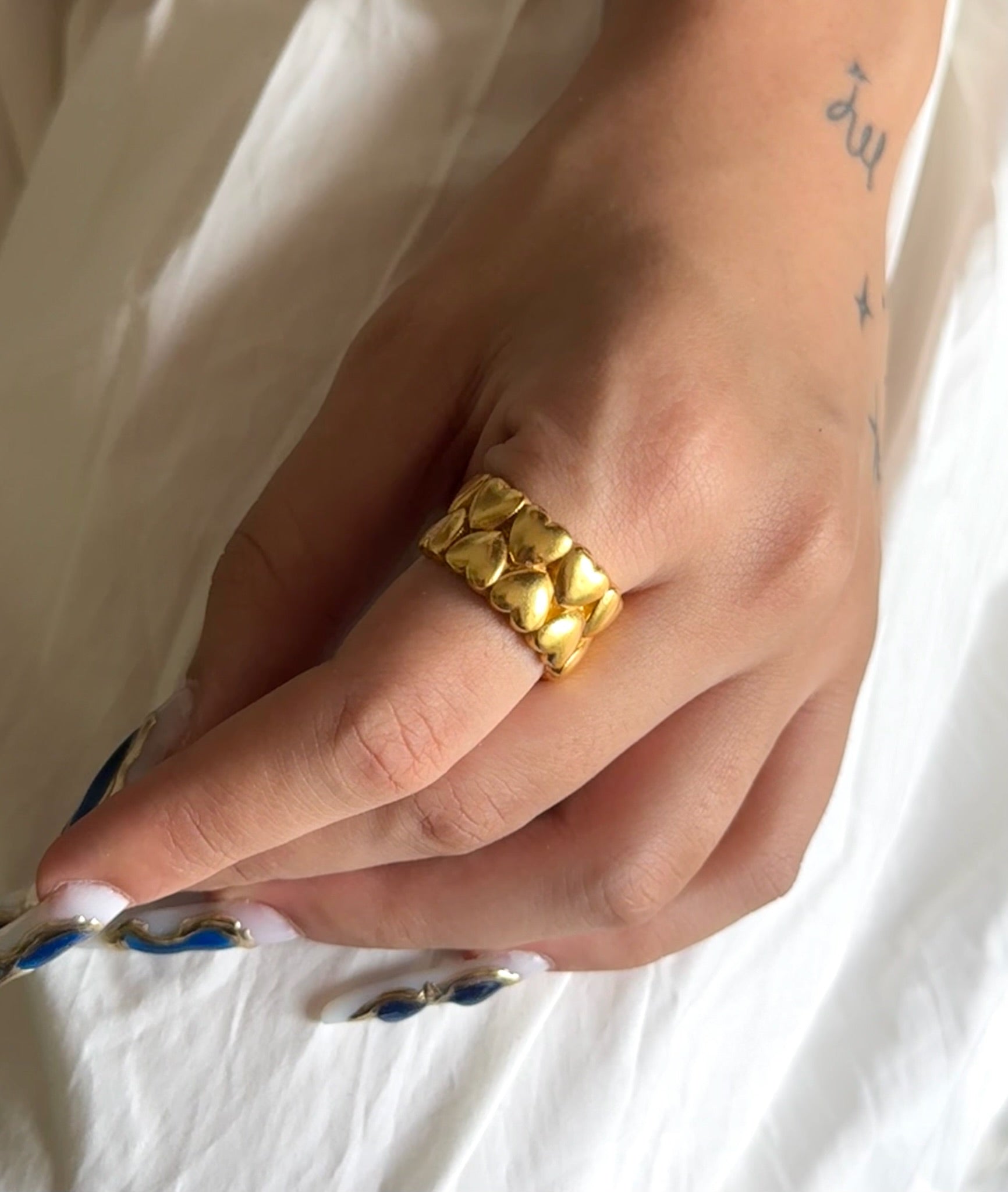 A bold statement softened by form, the Pillow Heart Ring features a full band of raised heart silhouettes—rounded, sculptural, and unapologetically feminine. Its smooth, puffed texture catches light with every movement, making it equal parts playful and powerful.