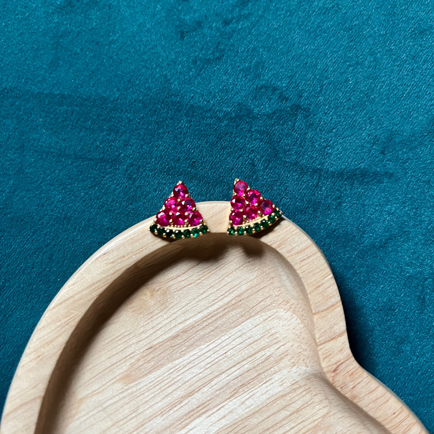 These fun and vibrant earrings are perfect for adding a playful twist to your jewelry collection. Crafted from high-quality brass with a 22kt gold plating, these earrings feature a charming watermelon slice design. The rich red and green gemstones are set in a gold frame, mimicking the juicy colors of the fruit, while the E-coating ensures long-lasting shine and protection from tarnishing. Lightweight and whimsical, these earrings are ideal for casual outings or to add a splash of color to your everyday look. A delightful accessory for anyone who loves to express their style with a touch of fun and creativity.