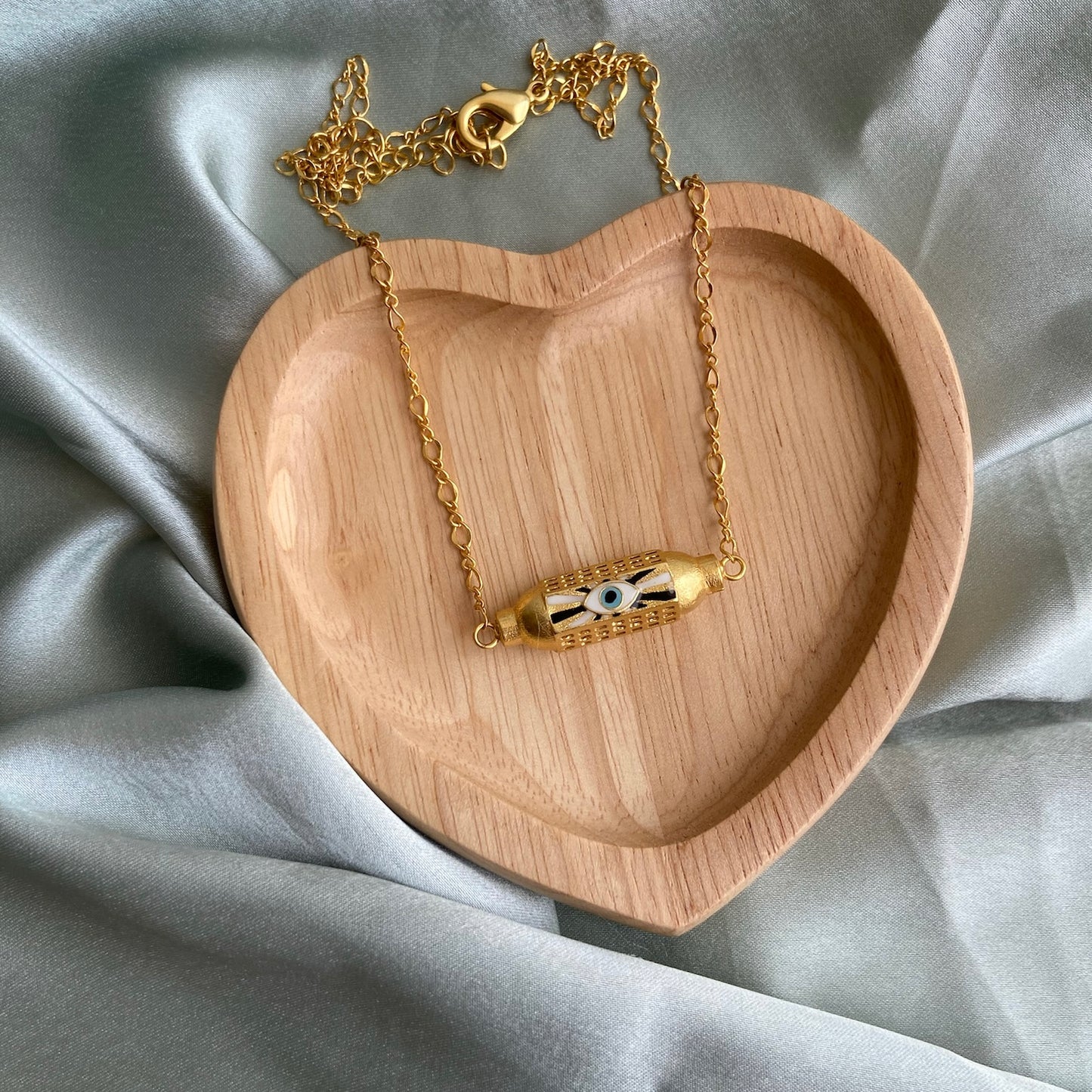 Introducing our enchanting Taveez Style Necklace, a perfect blend of vintage allure and modern sophistication. Crafted with utmost care, this necklace is made from brass and exquisitely plated with 18kt gold. Its standout feature is the enamelled evil eye pendant in the center, inspired by the traditional Nazariya style, designed to protect you from negative energies.