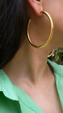 Some boss babe energy in our tube hoops! From day to night, slay in our xl hoops. Perfect to pair up with your basics! Made in brass, plated in 18kt gold.